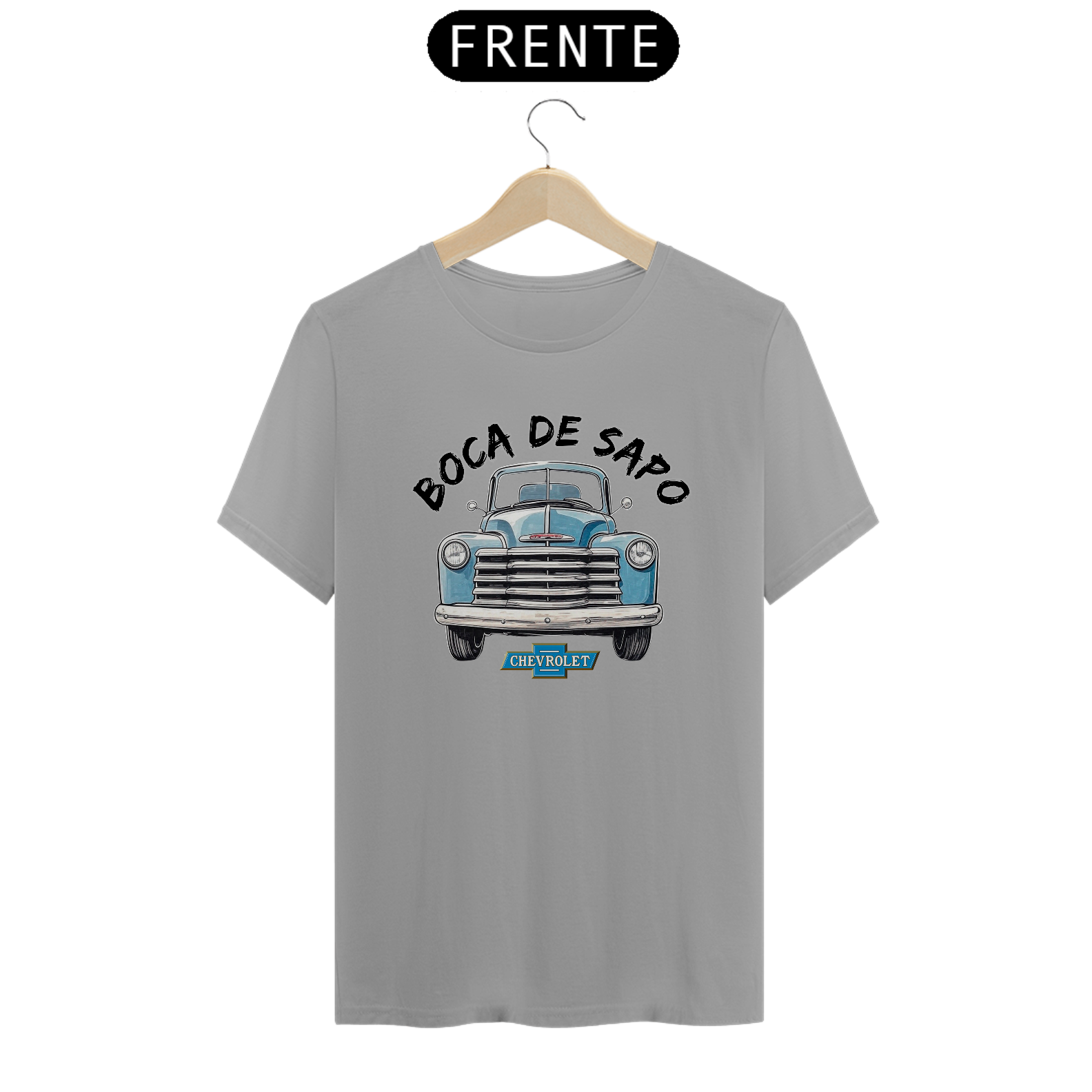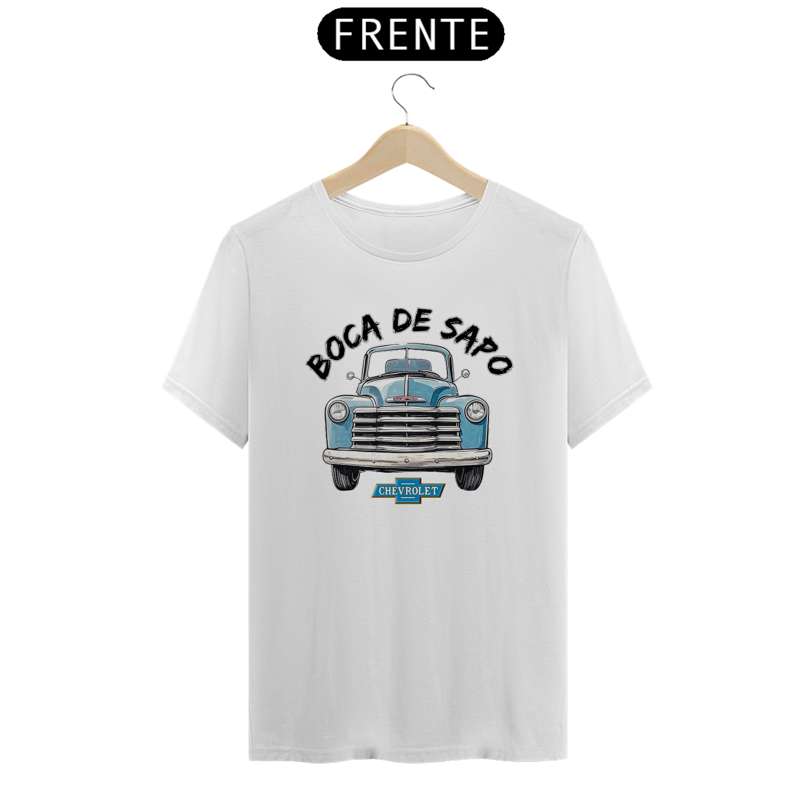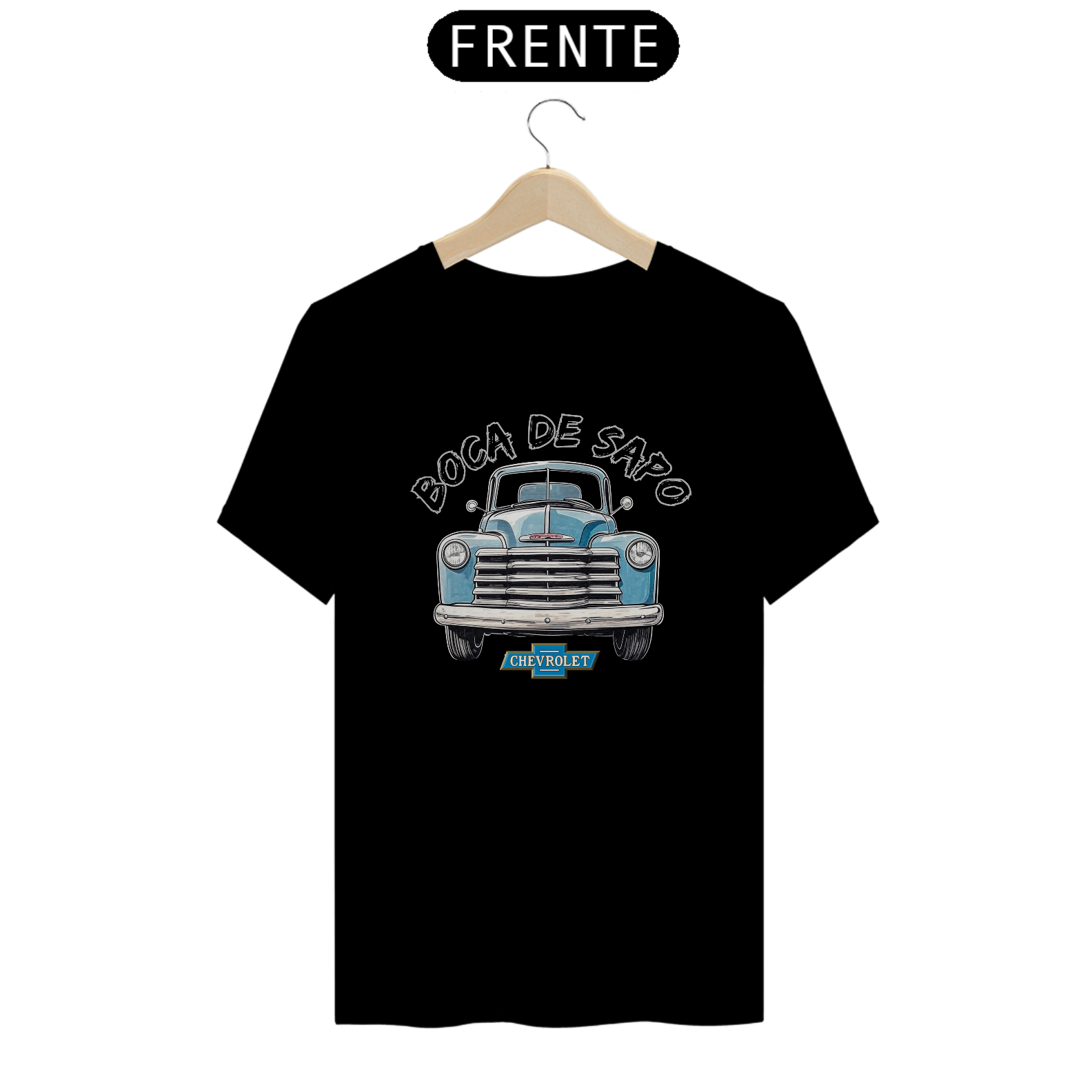 E para fechar com chave de ouro, a logo vintage da Chevrolet abaixo da ilustração sela a estampa como um verdadeiro tributo aos clássicos que marcaram gerações.