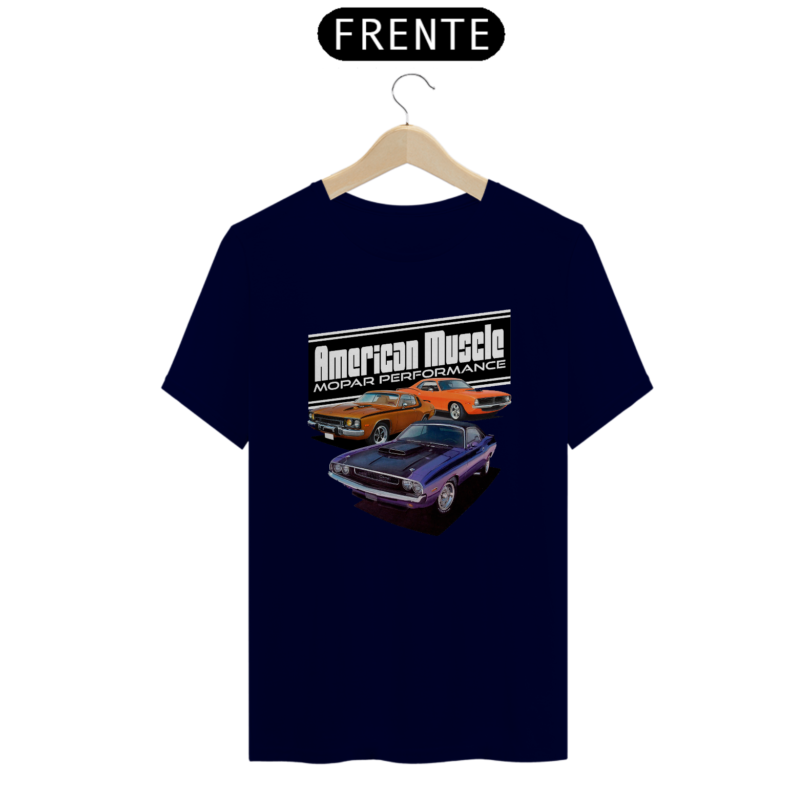 Com a frase "American Muscle Mopar Performance" destacada, esta camiseta homenageia a potência e a excelência de desempenho dos lendários veículos Mopar.