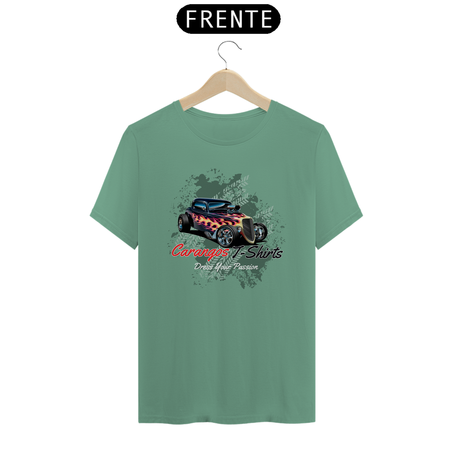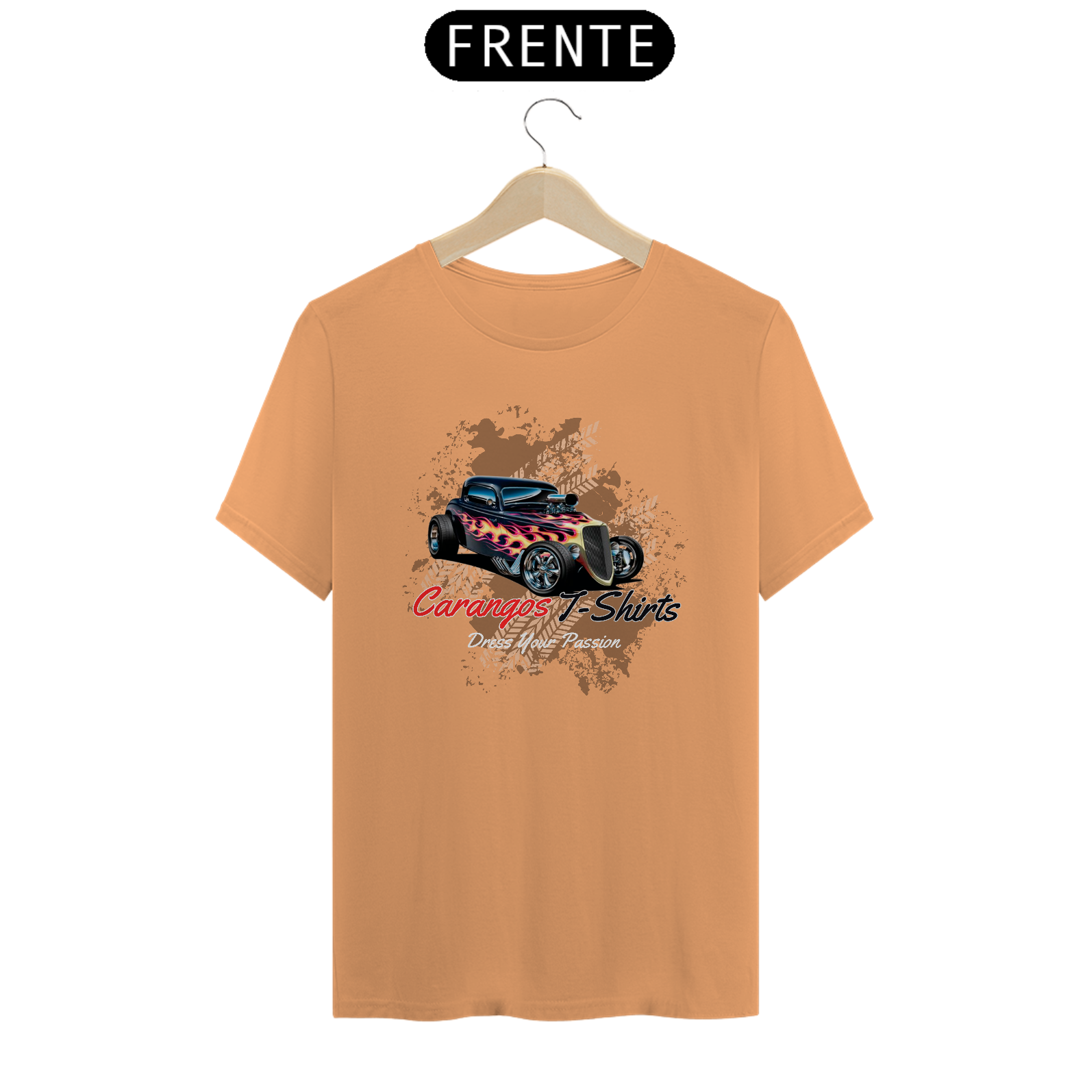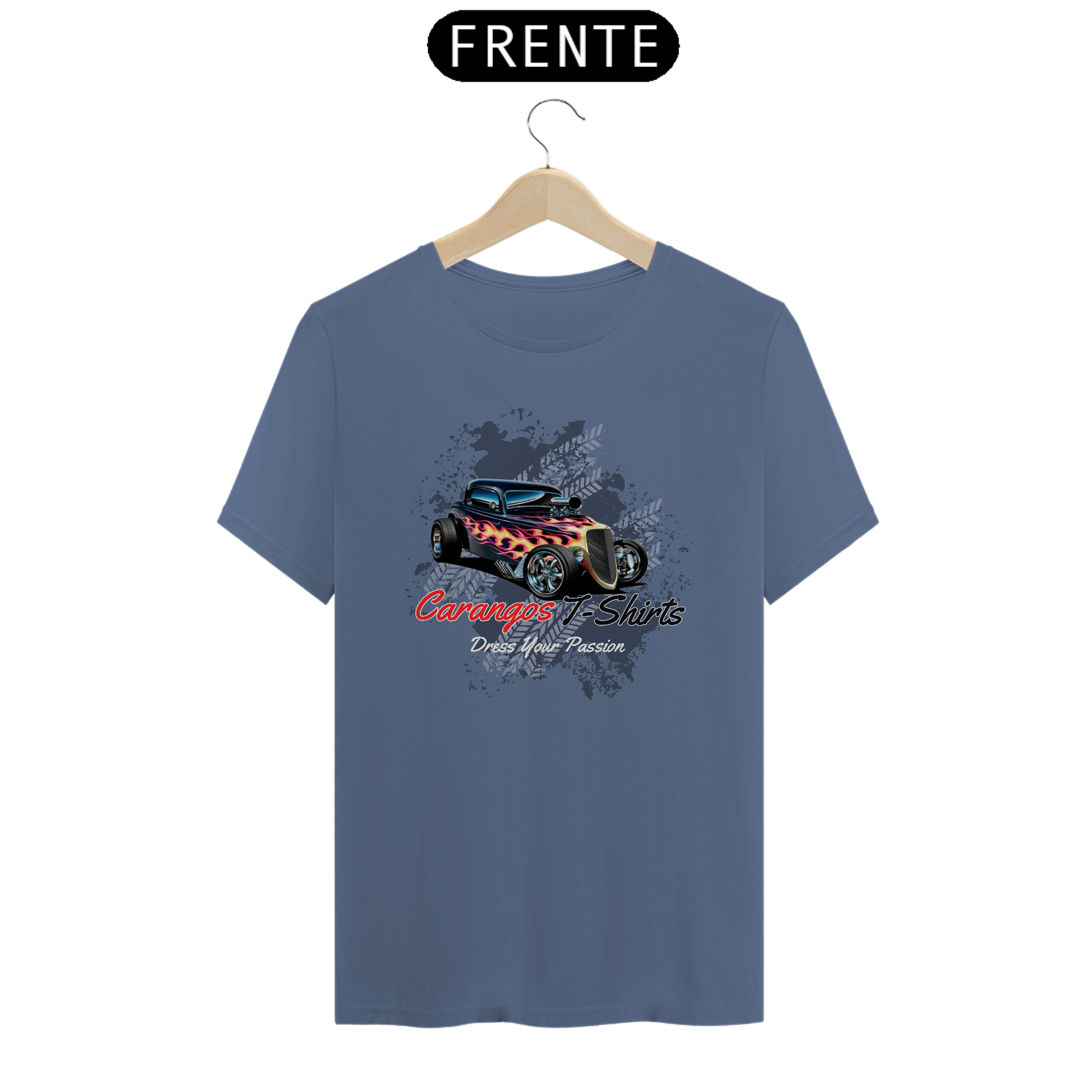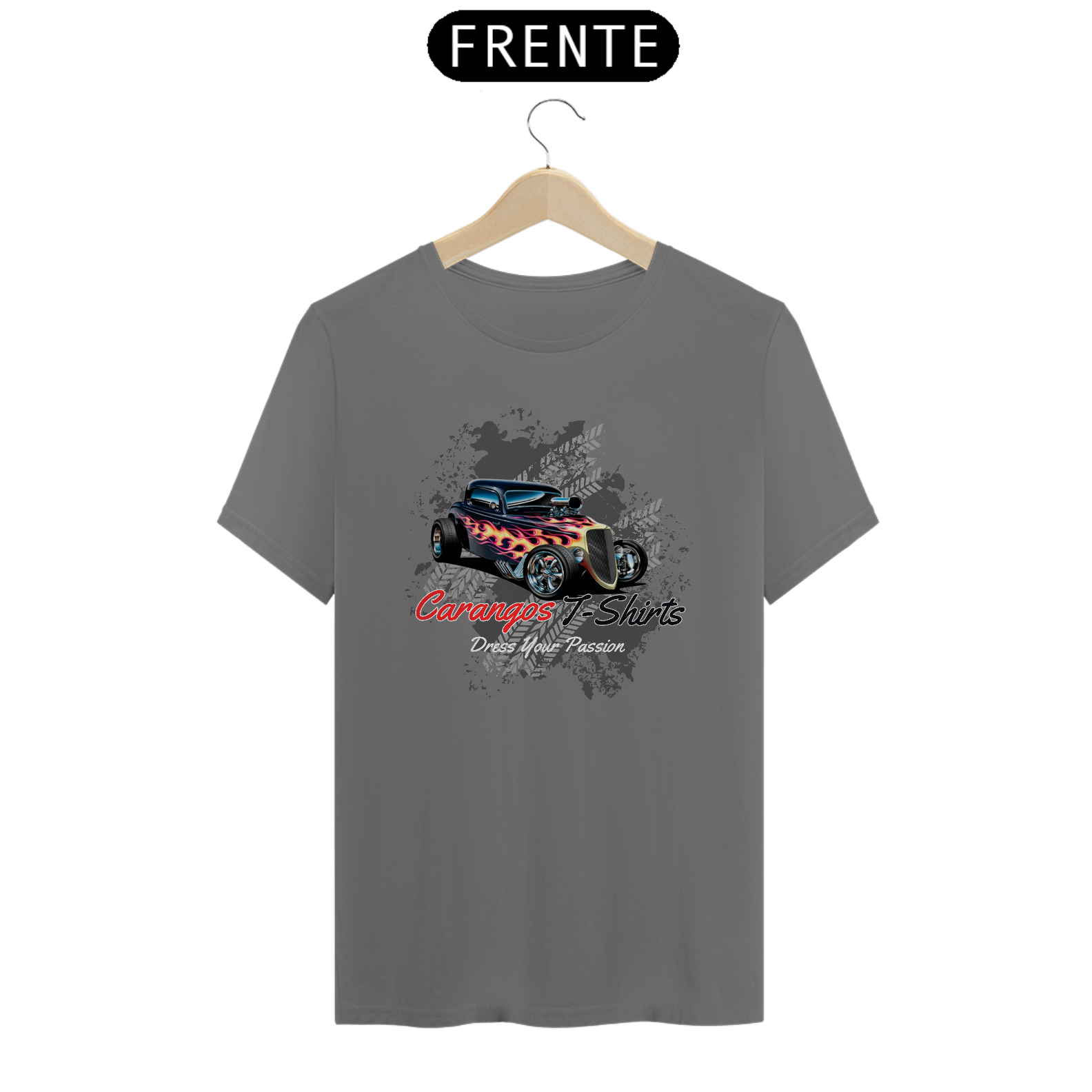 • Design icônico: Logo tradicional da Carangos T-Shirts com a frase inspiradora "Dress Your Passion".