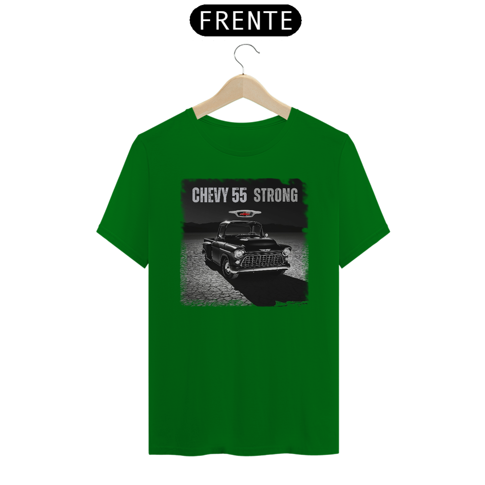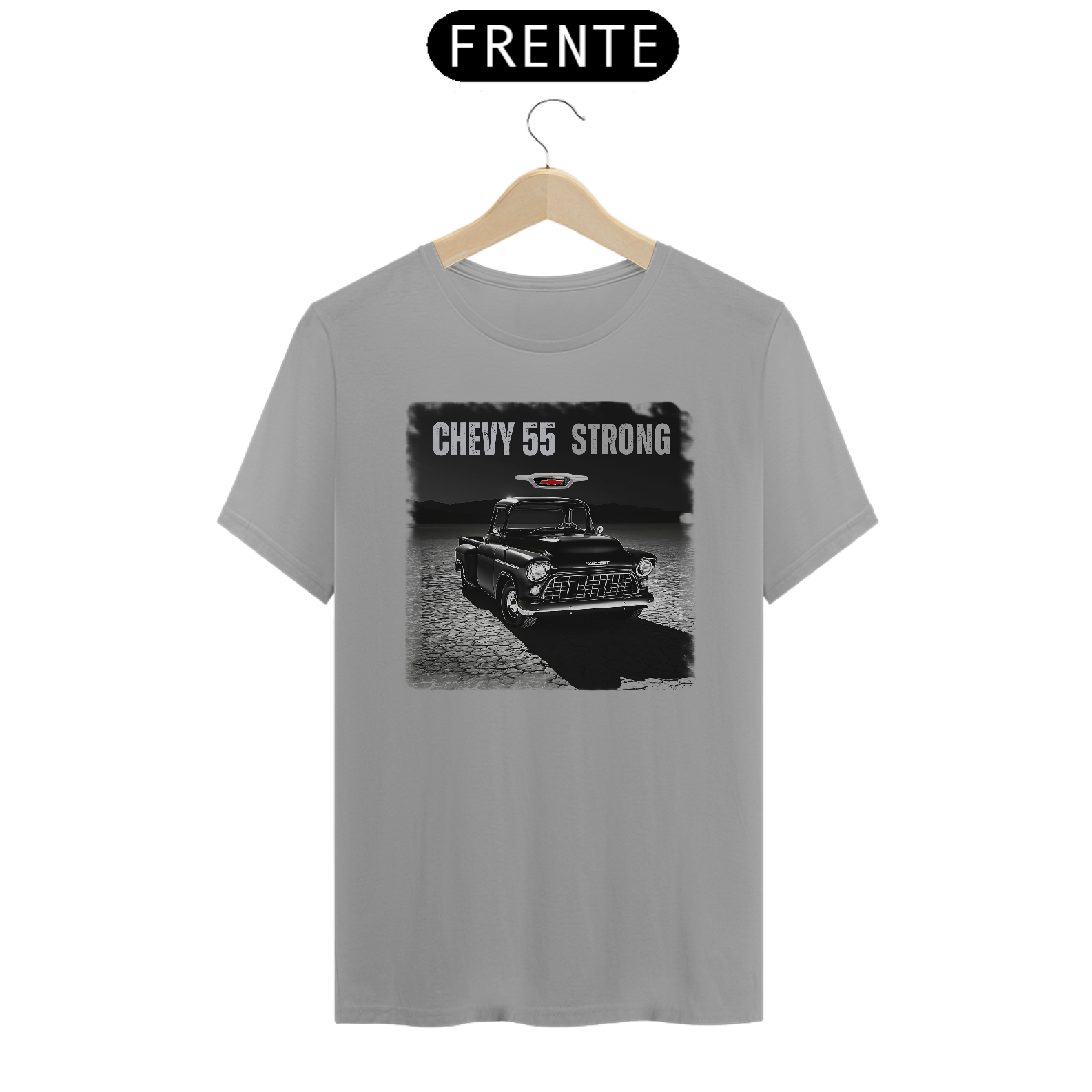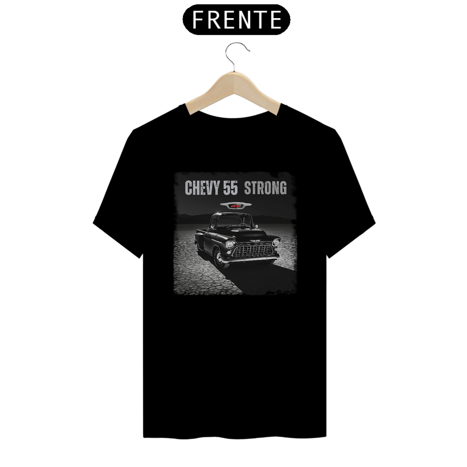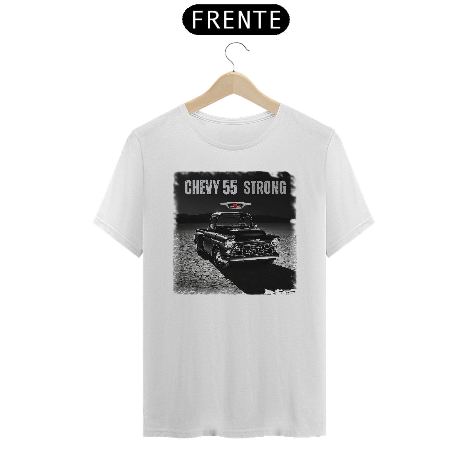 Experimente o poder e a elegância de uma verdadeira lenda automotiva com nossa exclusiva camiseta "Chevy 55 Strong".