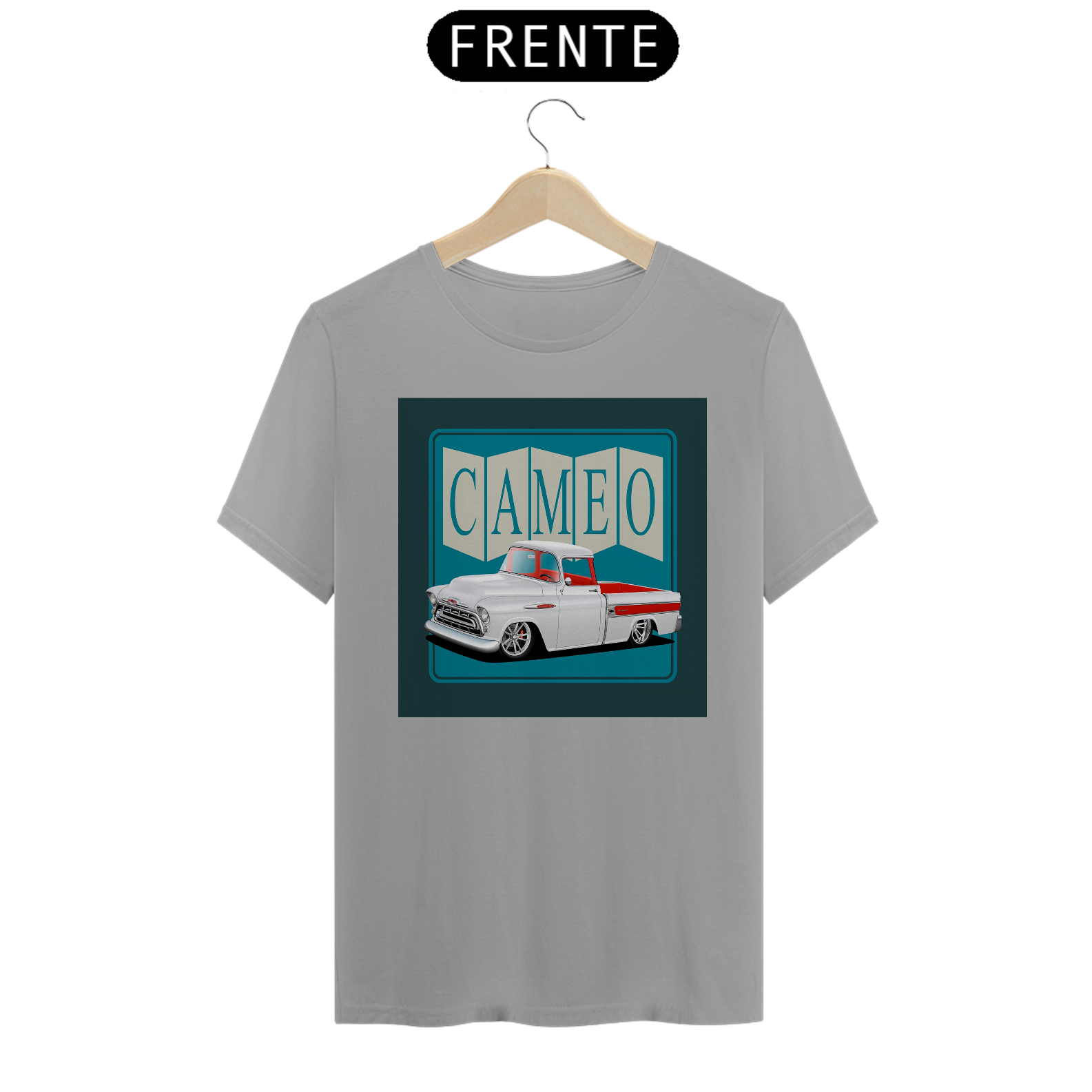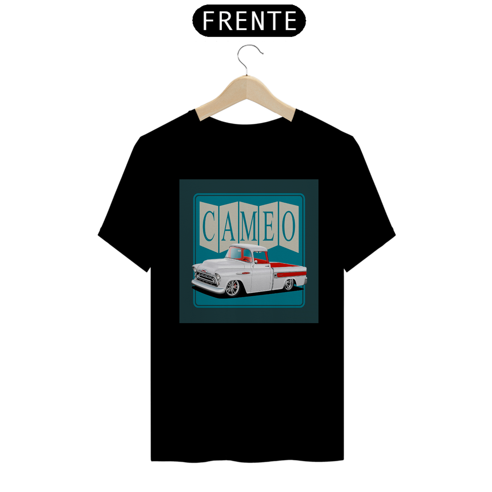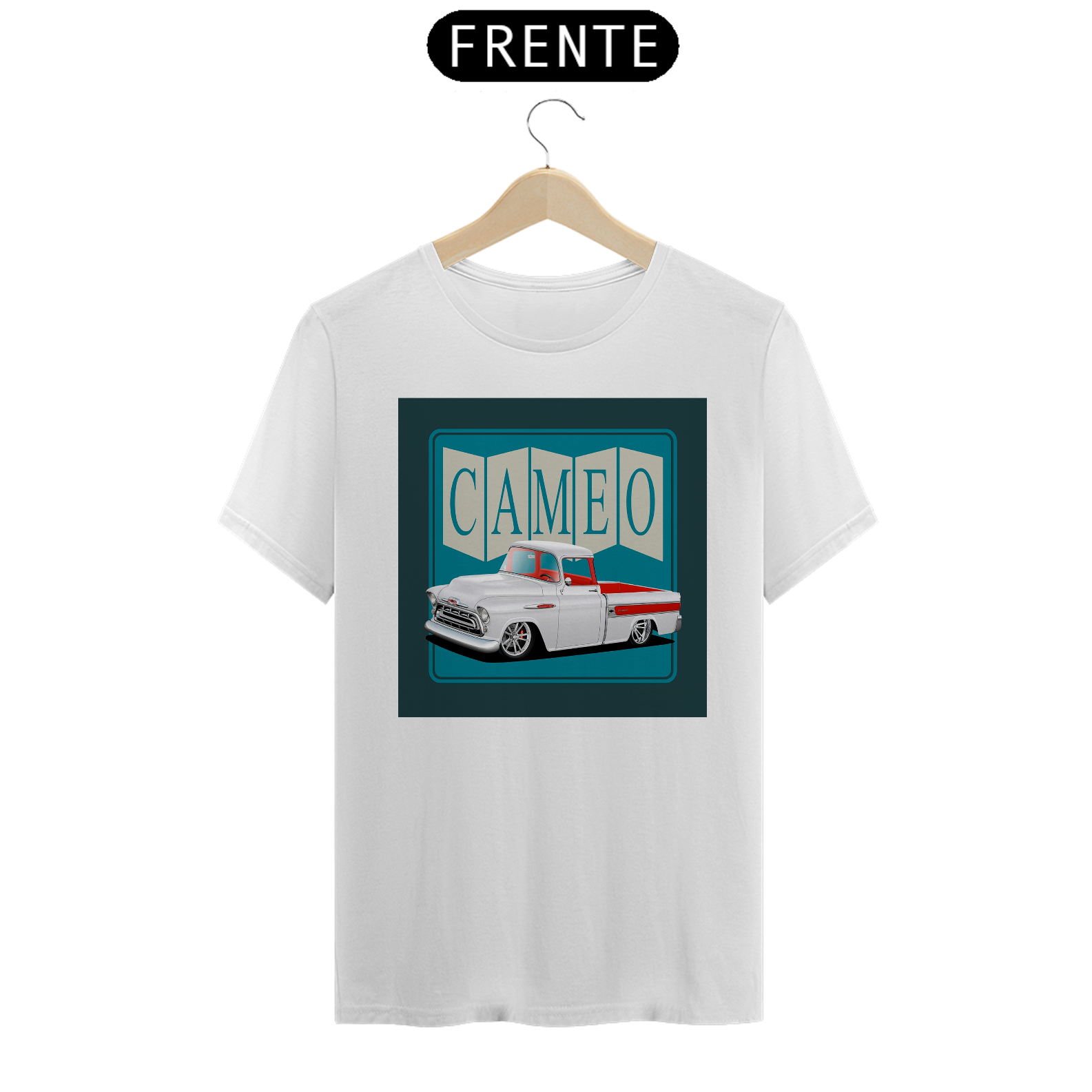 Esta camiseta exibe um desenho detalhado da icônica pickup Chevrolet Cameo, celebrando sua elegância e importância na história automotiva.