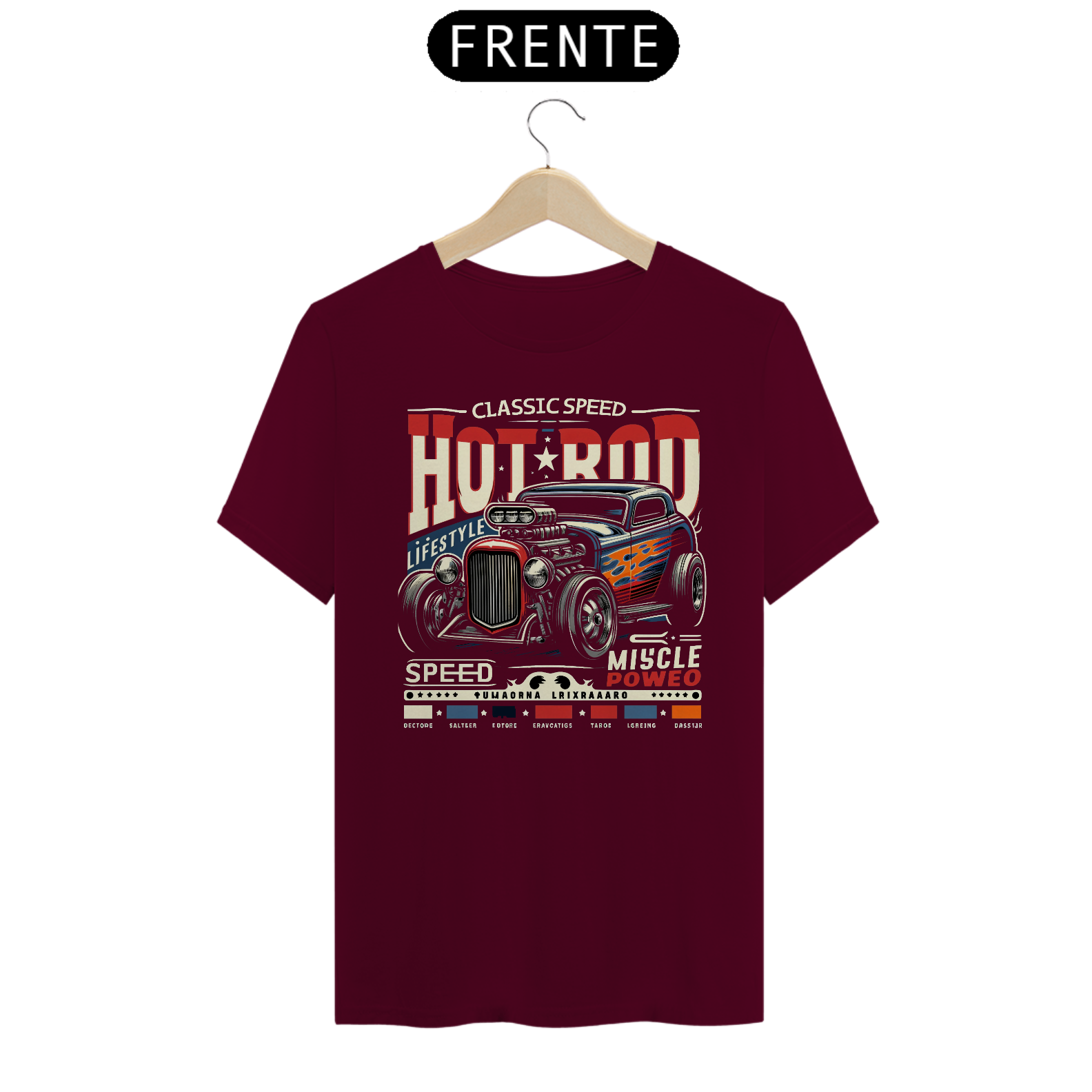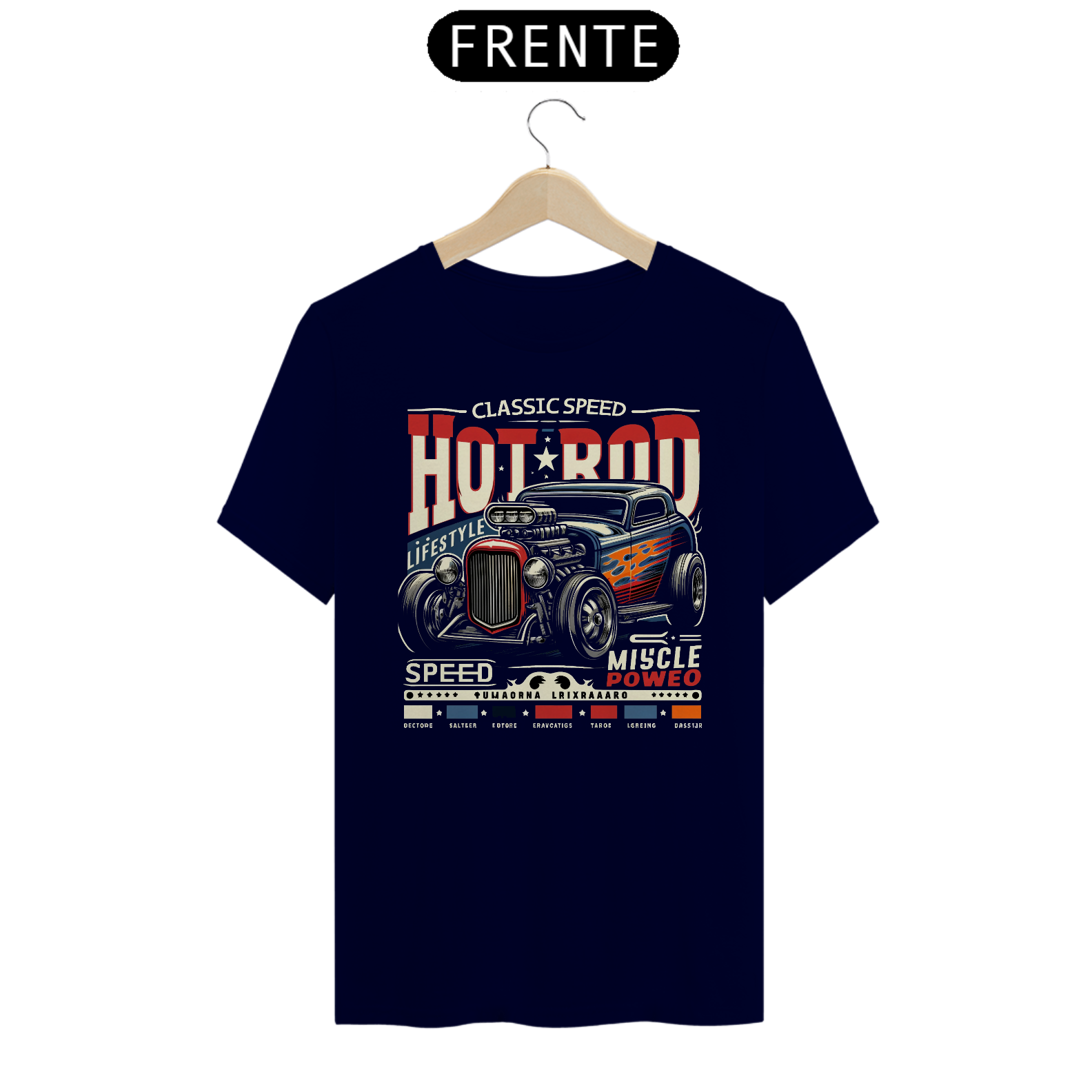 Camiseta "Classic Speed": Inspirada na adrenalina e estilo do movimento Hot Rod, esta camiseta destaca-se com uma estampa arrojada de um Hot Rod clássico com destaque ao potente V8 e o Blower saliente, chamas  laterais e detalhes que remetem à era dourada das corridas de rua.