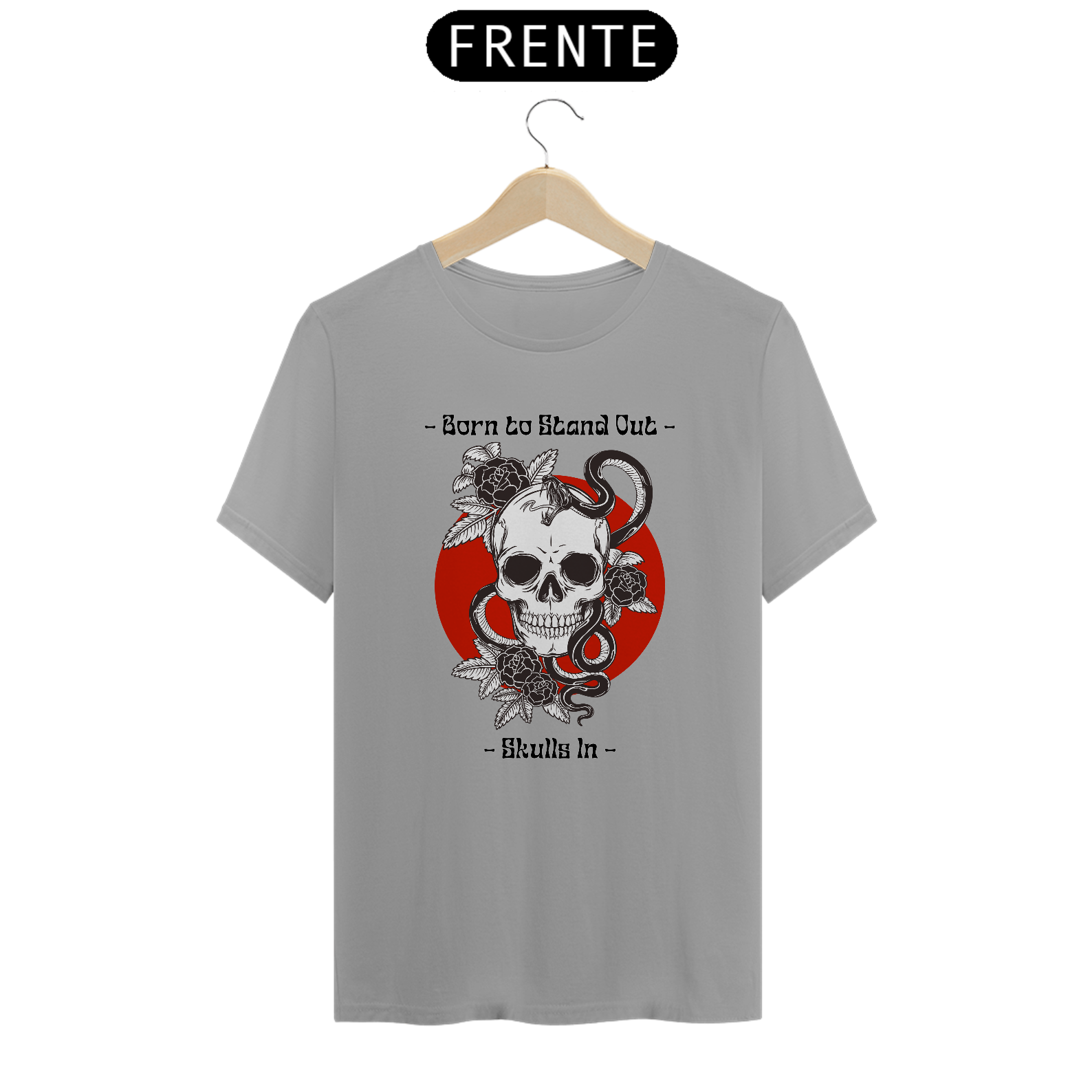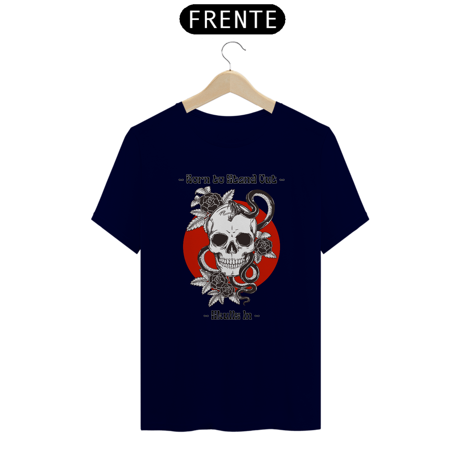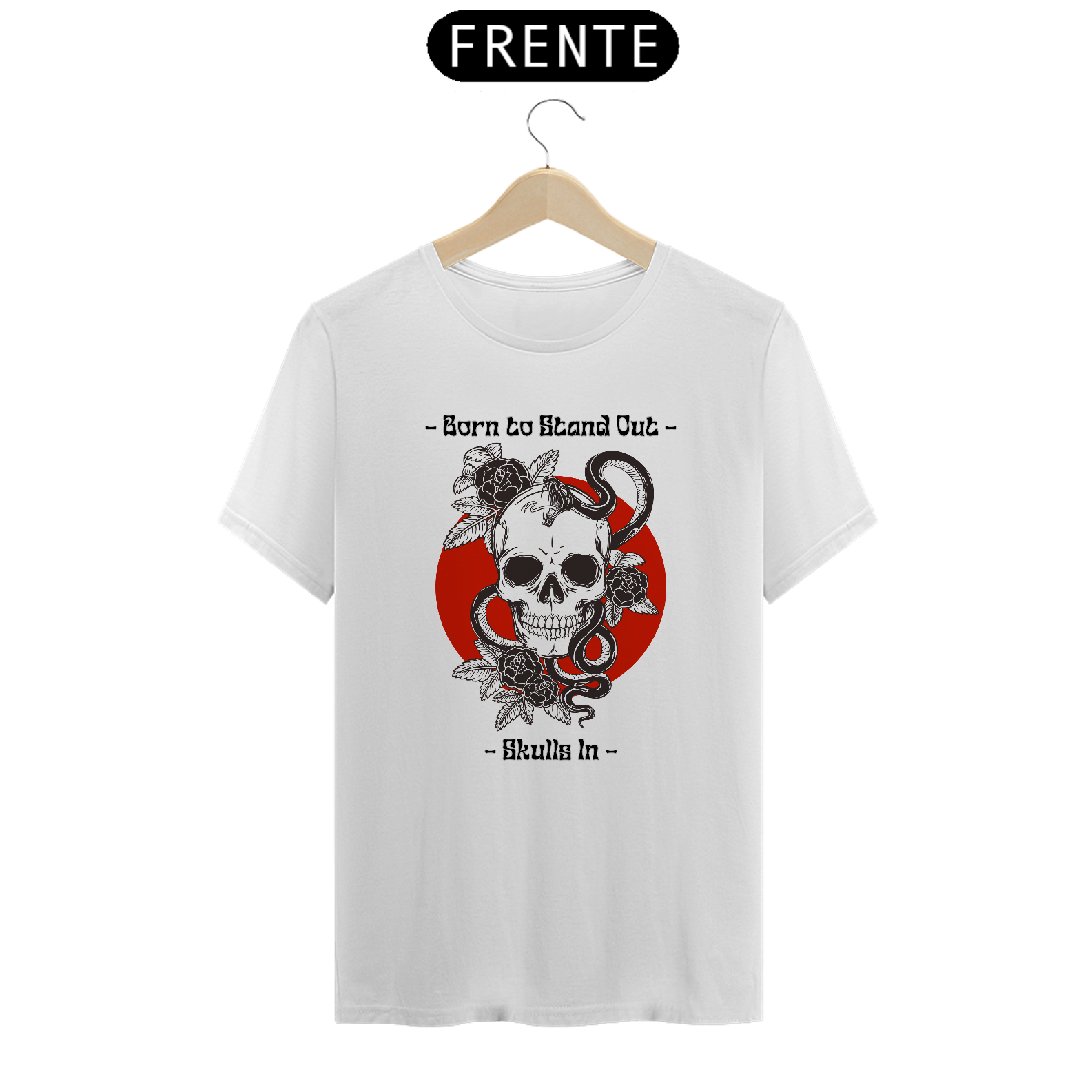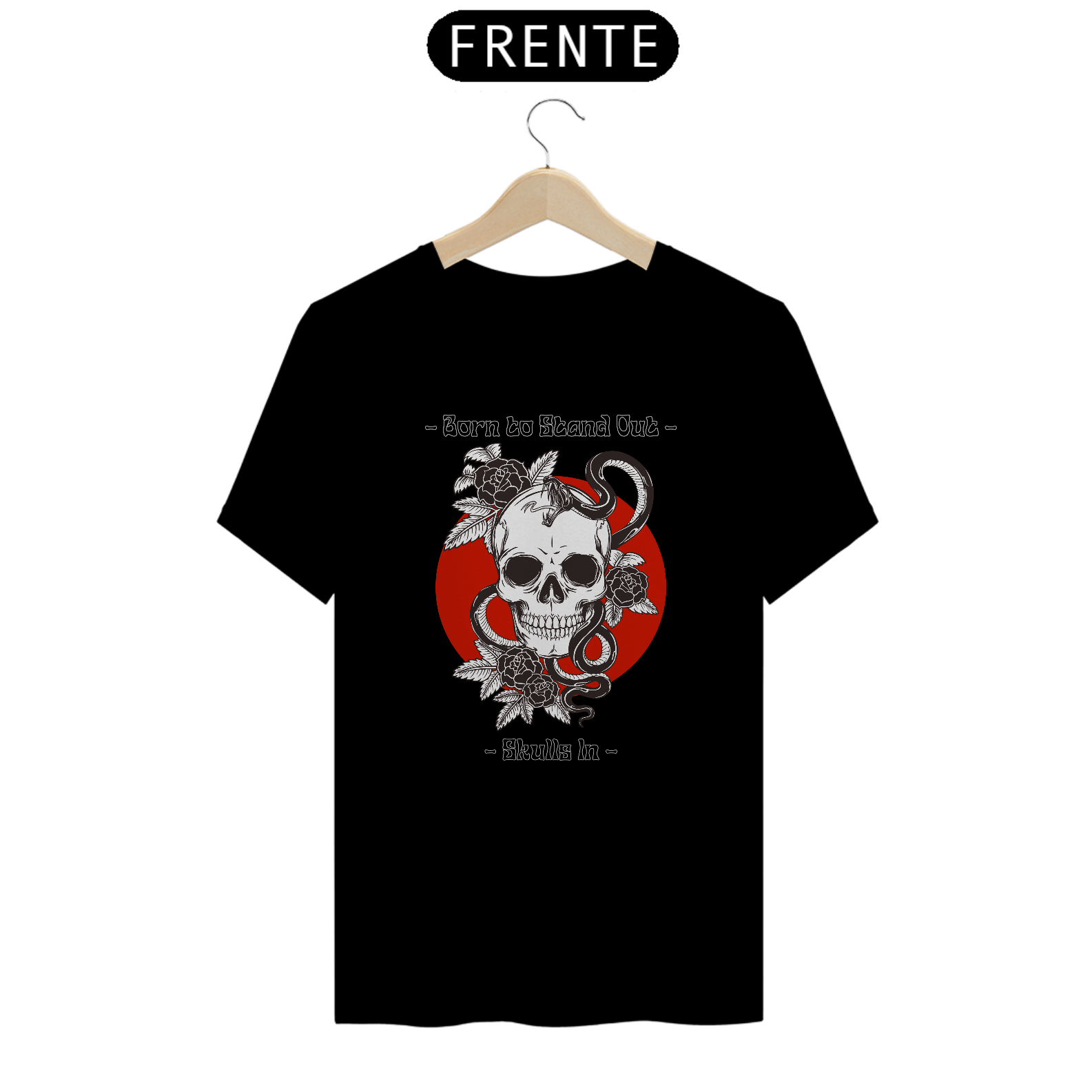 • Estampa nas costas: Um crânio estilizado adornado com flores, acompanhado da frase "Burn to Stand Out" (Nascido para se Destacar) e "Skulls In" (Crânios em Alta), ideal para quem busca se destacar com personalidade.