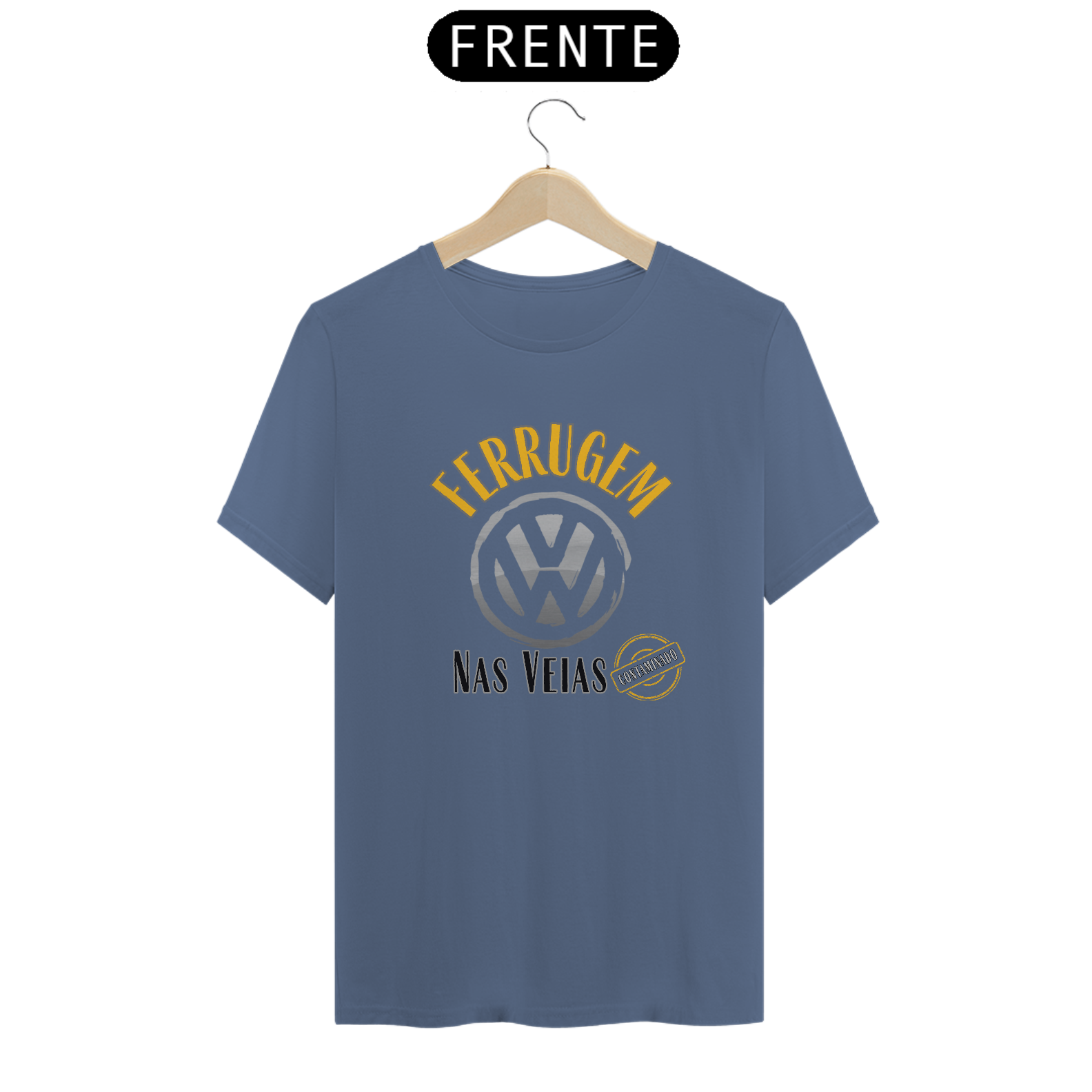 Com uma proposta clean e autêntica, a estampa traz a frase "Ferrugem nas Veias" envolvendo a clássica logo retrô da Volkswagen, em referência direta ao legado dos Fuscas, Kombis, Variants e tantos outros ícones da era Air Cooled. Abaixo, o carimbo “Contaminado” reforça que quem entrou nesse mundo, foi picado pelo vírus da graxa, do ronco grave e da refrigeração a ar — e não tem mais volta.