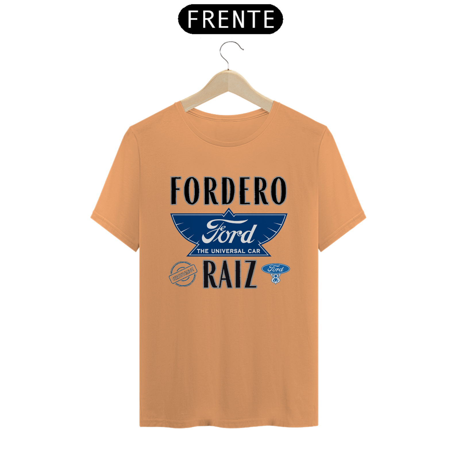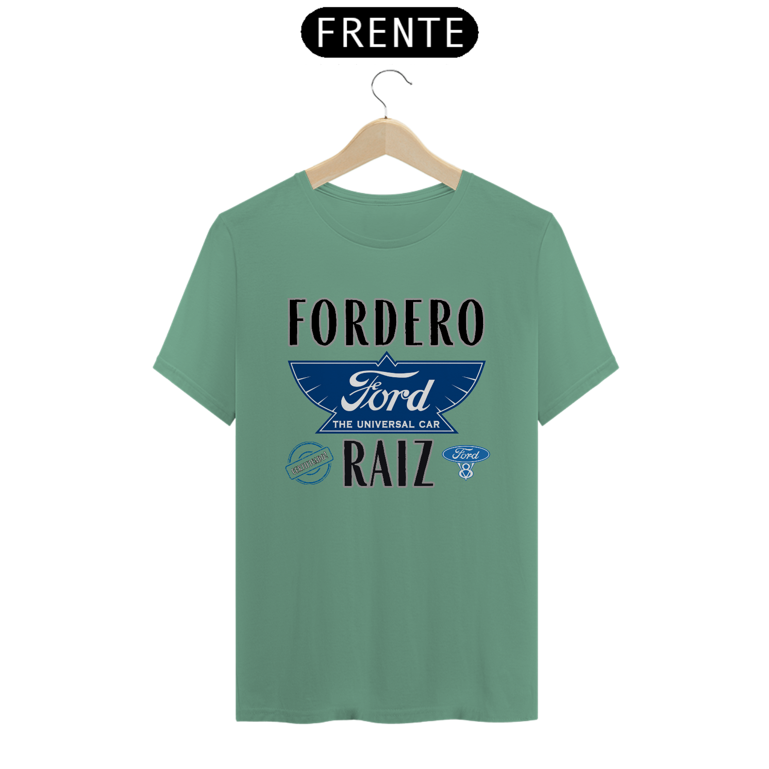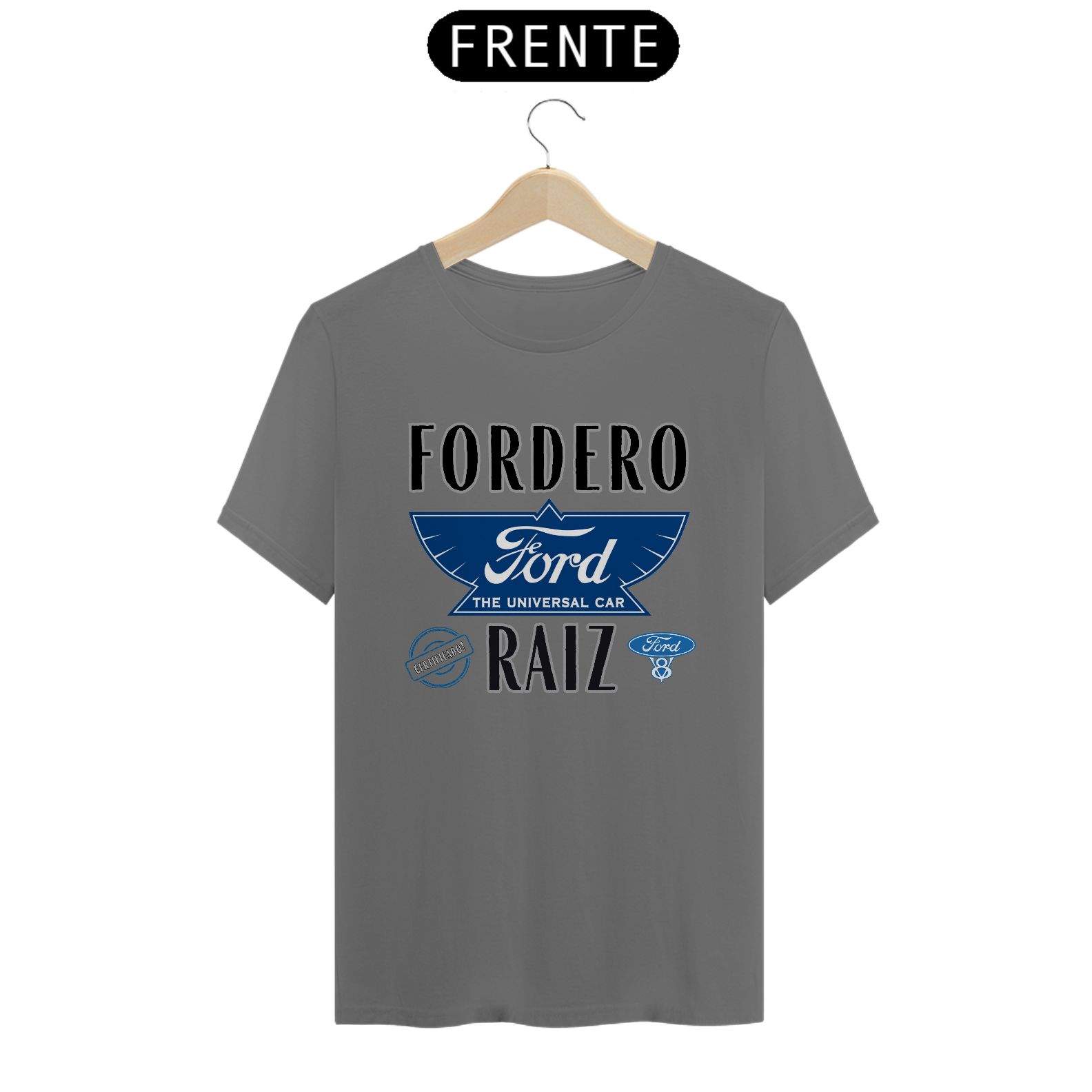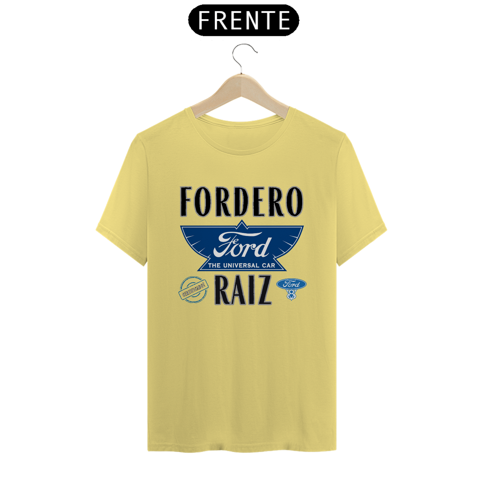 No centro da estampa, a logomarca antiga da Ford Motor Company, tal como usada nos primeiros tempos da fábrica em Michigan, EUA, evoca a essência da história automotiva. Ao redor dela, a frase "Fordero Raiz" vem como um grito de orgulho para quem vive e respira o universo Ford. E pra selar tudo isso, o carimbo “Certificado” confirma: esse aqui é raiz de verdade.