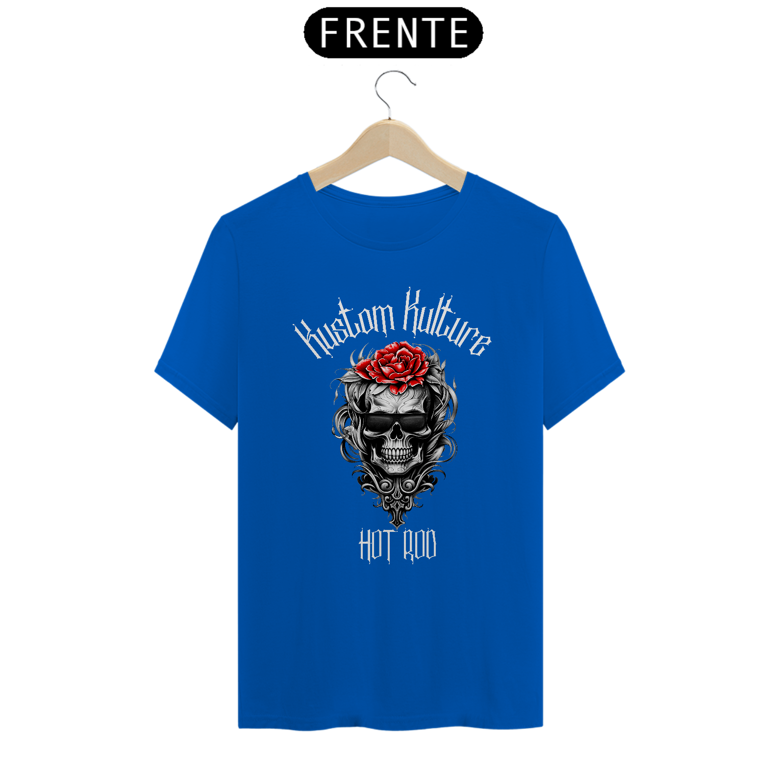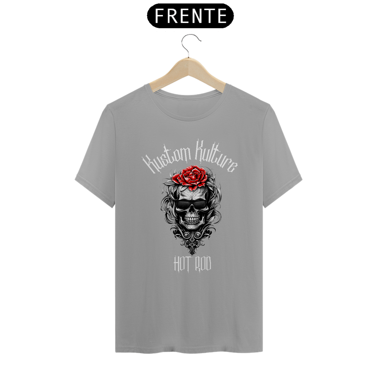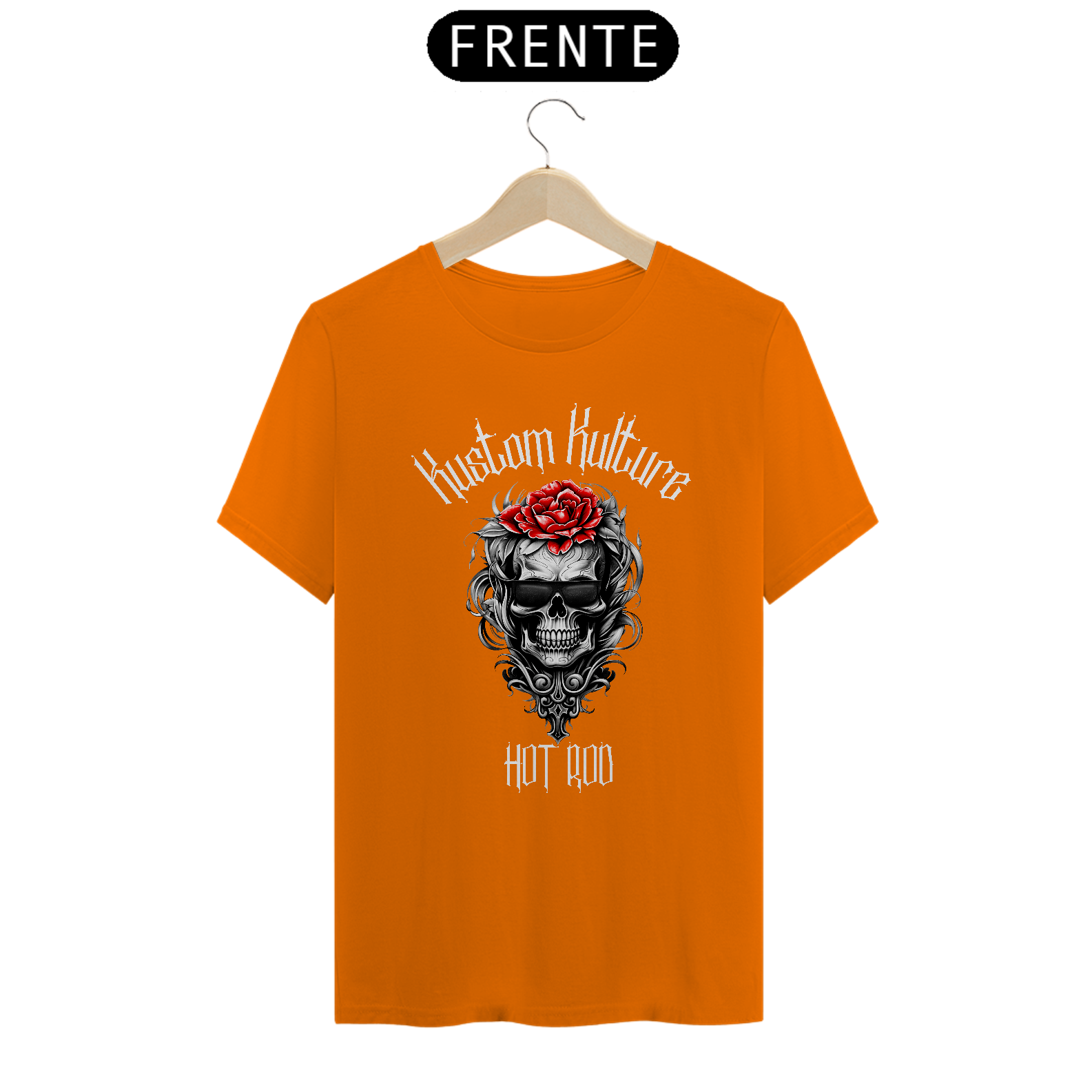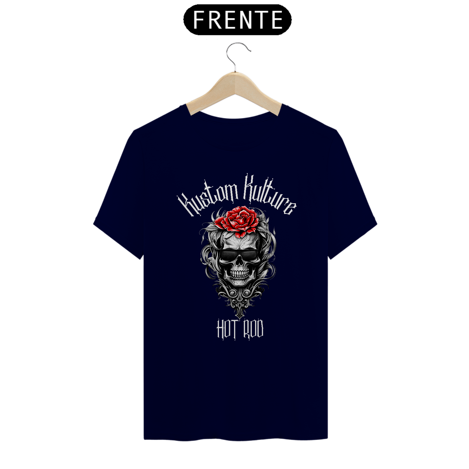 • Estampa nas costas: Um design marcante com uma caveira de óculos escuros, uma rosa na cabeça e os dizeres "Kustom Kulture" no topo, acompanhados por "Hot Rod" abaixo, celebrando a paixão pelos carros customizados e o estilo de vida autêntico.