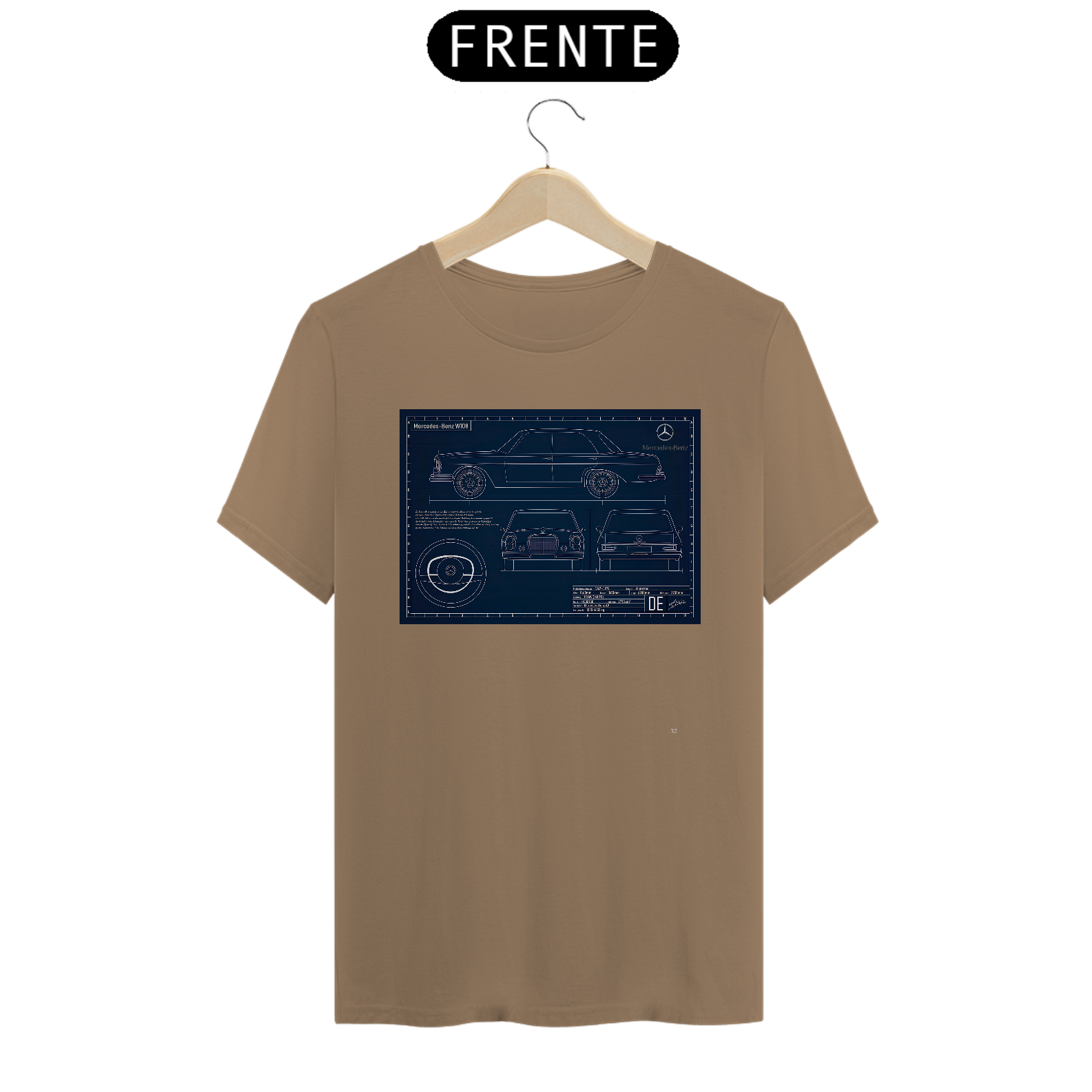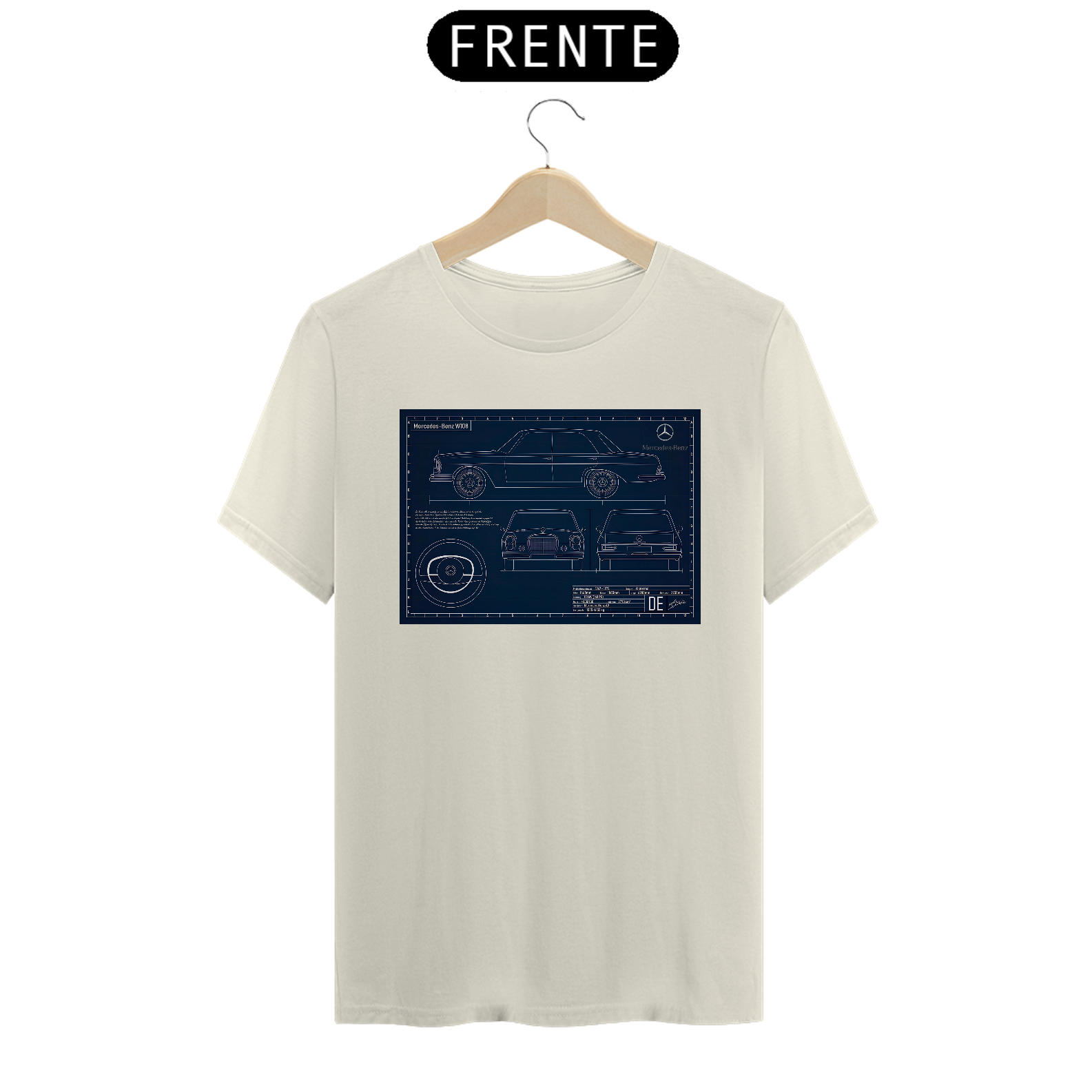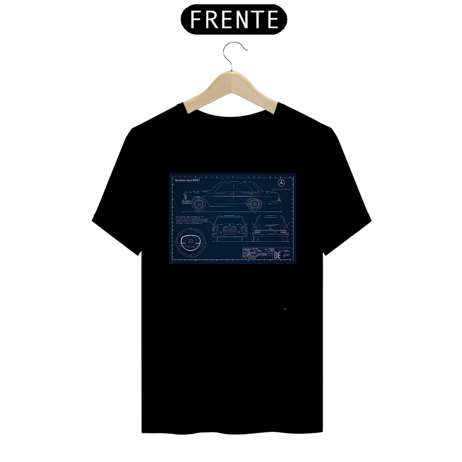 Estampa no peito: Ficha técnica estilizada da carroceria Mercedes-Benz W108, com informações detalhadas e um design técnico exclusivo que homenageia o legado do sedã clássico.