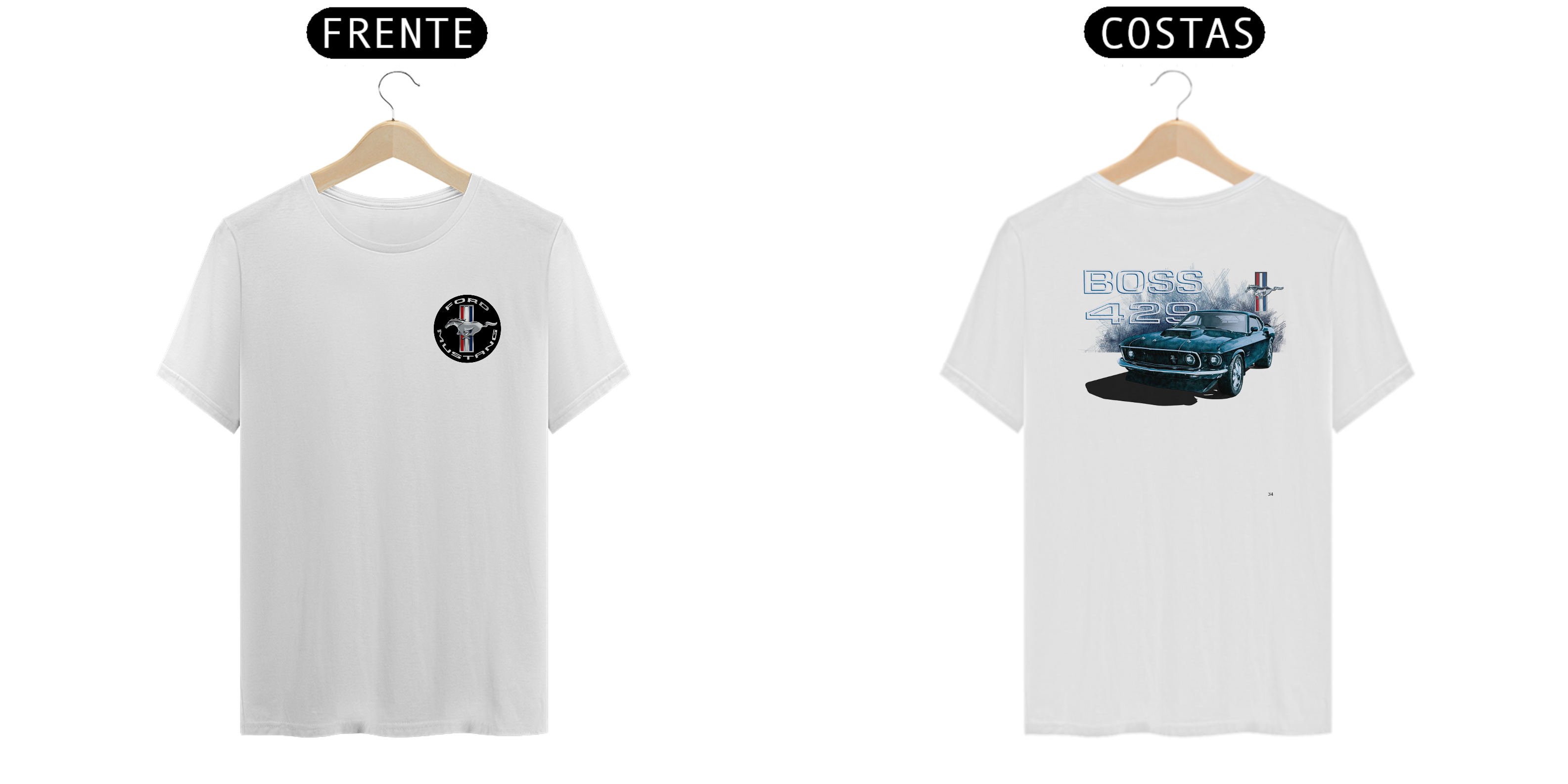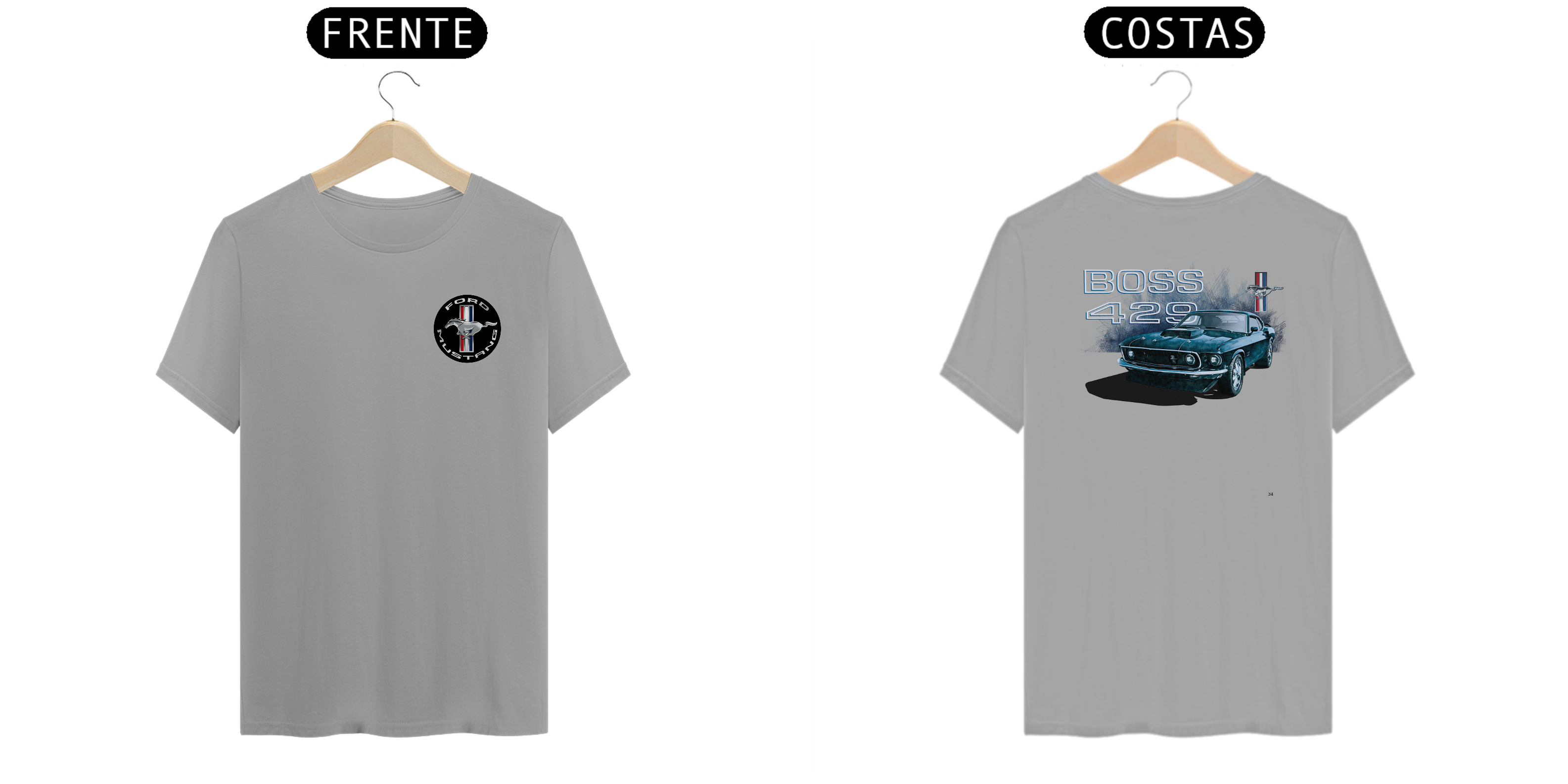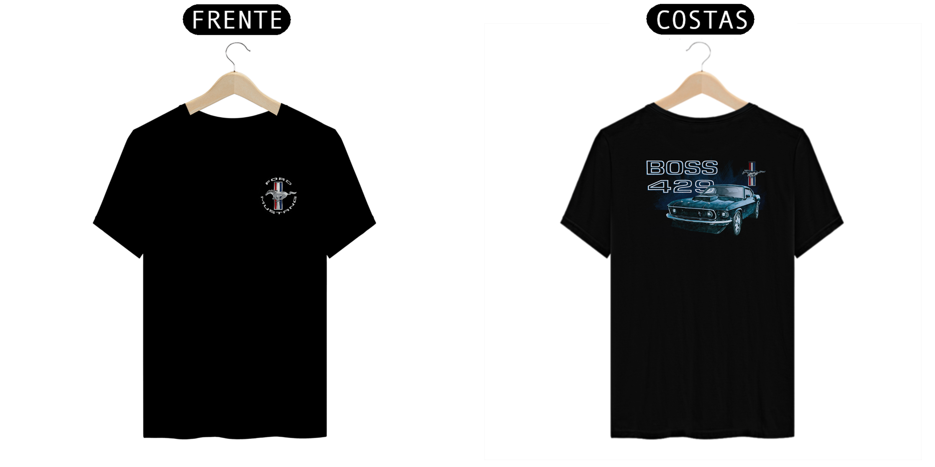 • Estampa nas costas: Uma arte estilizada do poderoso Mustang Boss 429 de 1969, destacando sua postura robusta e sua posição como um dos mais desejados muscle cars de todos os tempos.