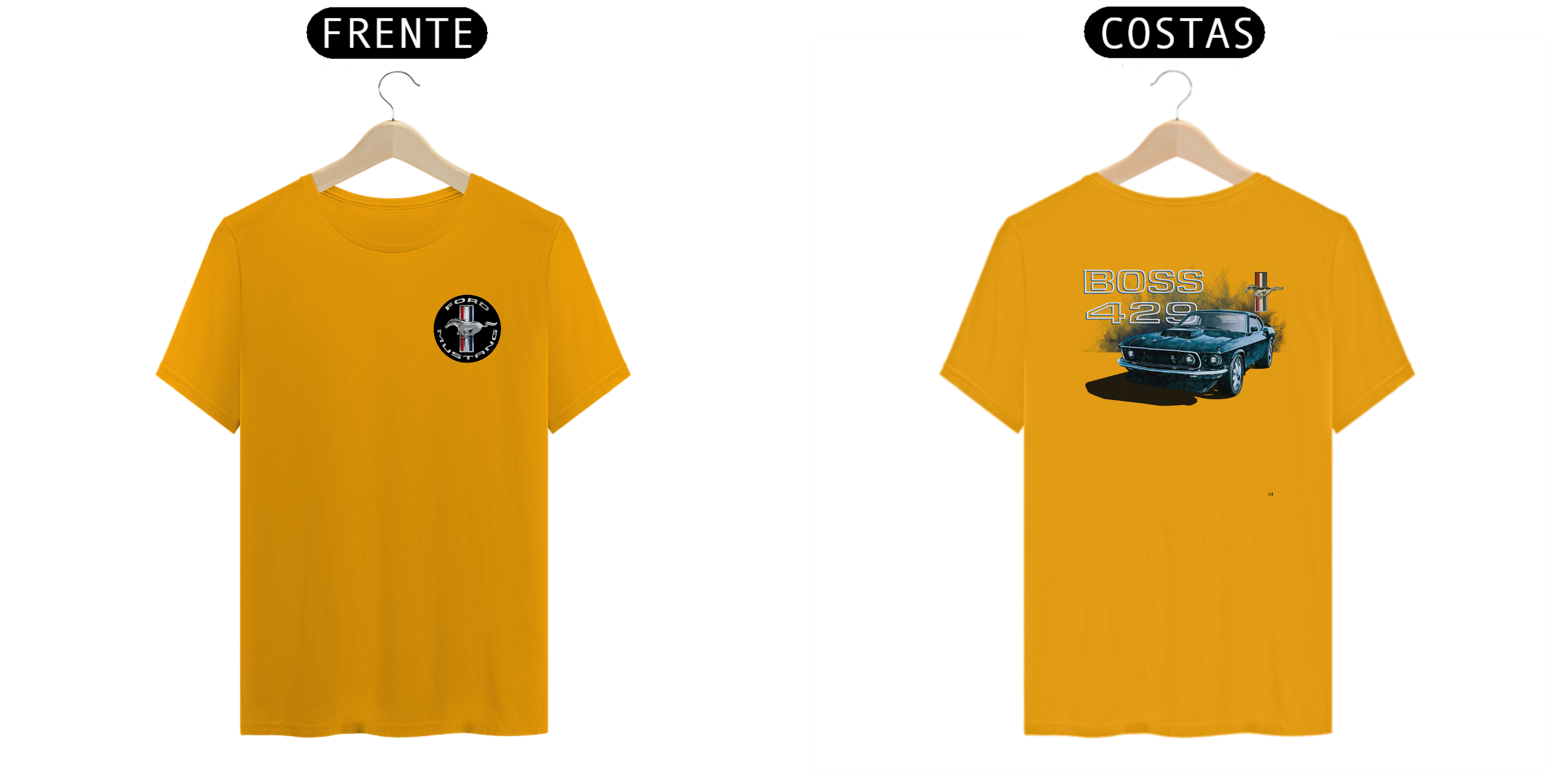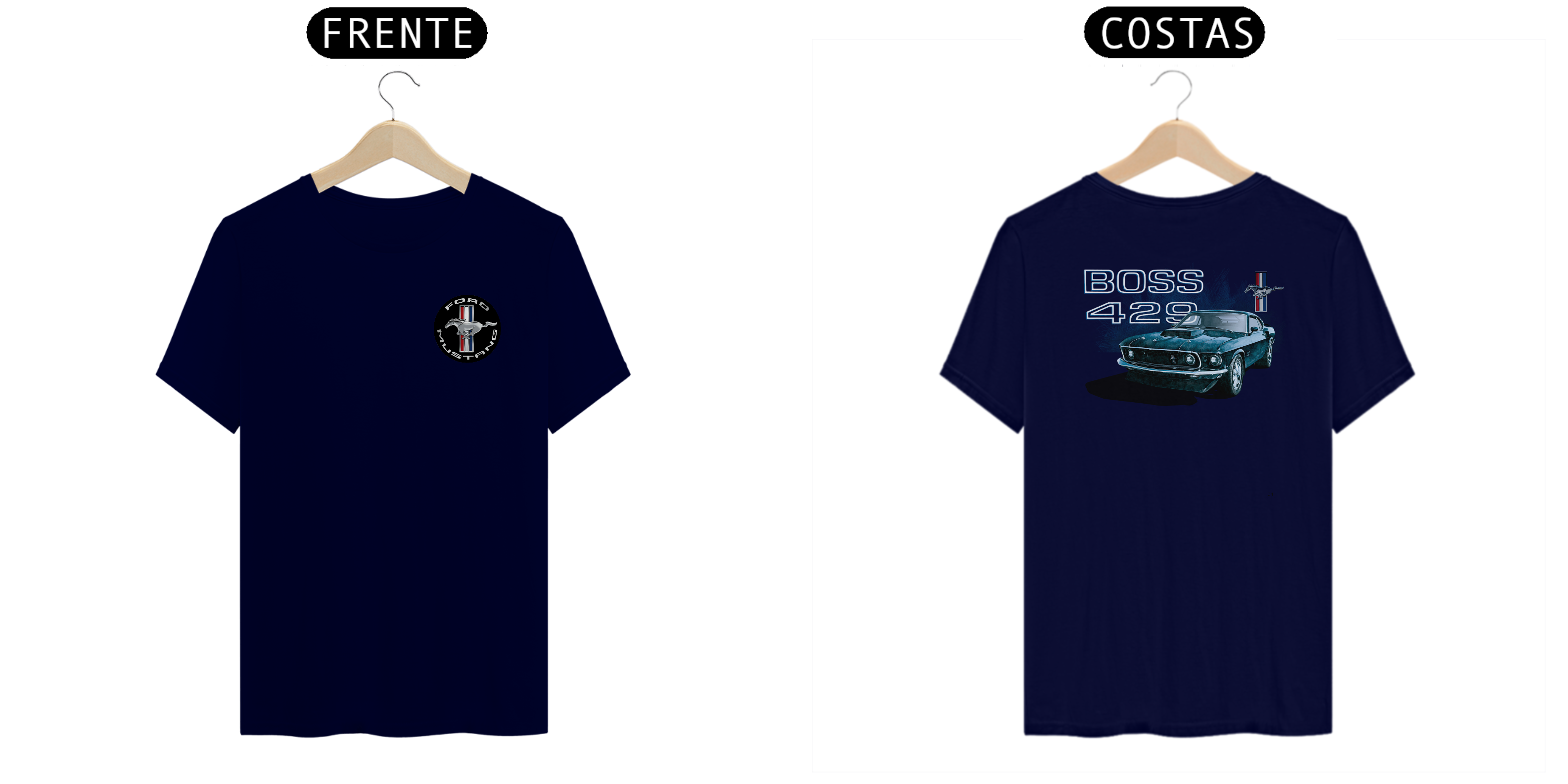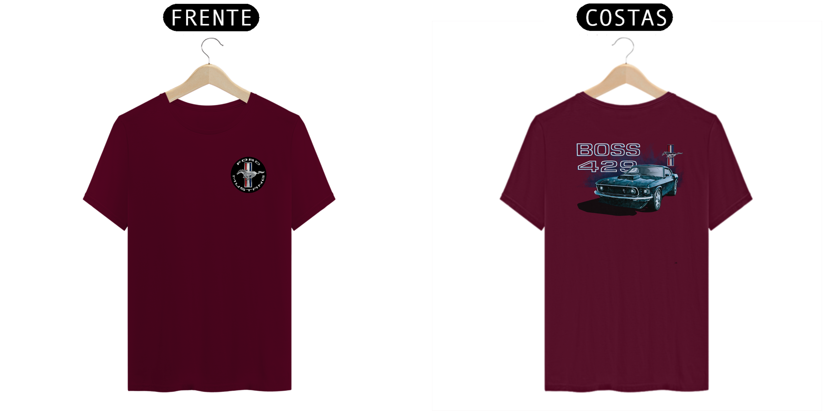 • Estampa nas costas: Uma arte estilizada do poderoso Mustang Boss 429 de 1969, destacando sua postura robusta e sua posição como um dos mais desejados muscle cars de todos os tempos.