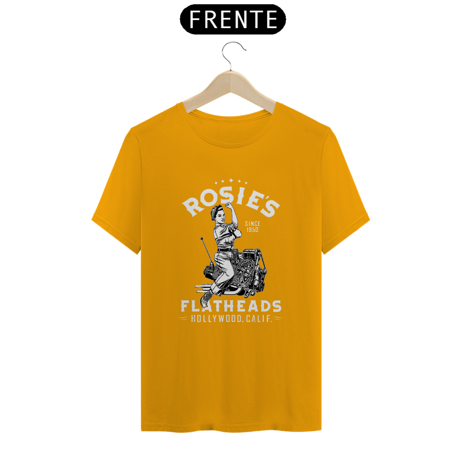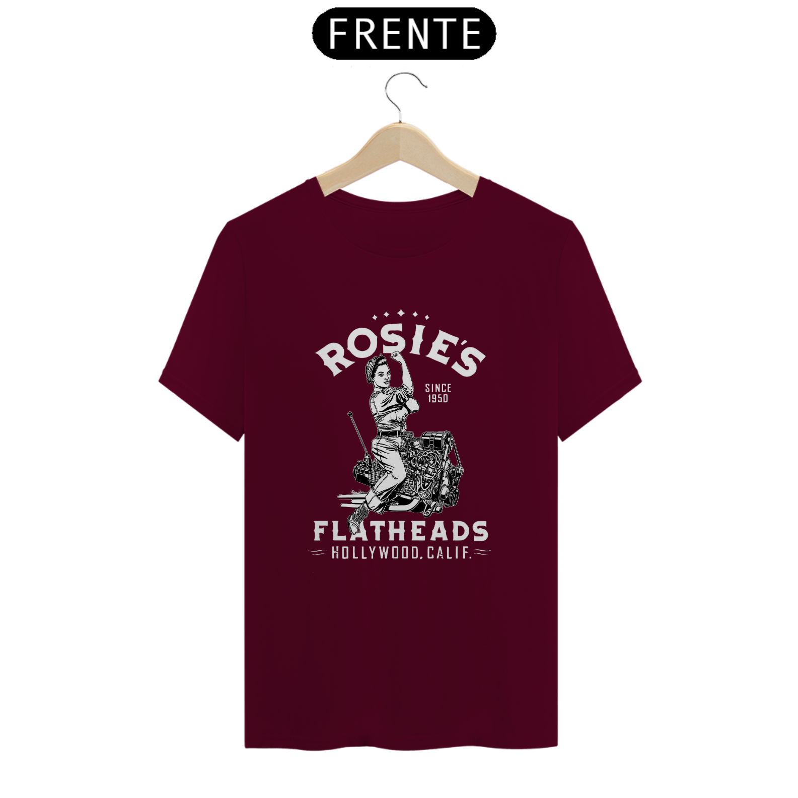 • Estampa: Uma elegante pinup sentada em um poderoso motor V8 Flathead, acompanhada da frase "Rosie's Flathead", remetendo a uma oficina fictícia comandada por uma mulher apaixonada por hot rods. Um design que une beleza e potência com um toque vintage.