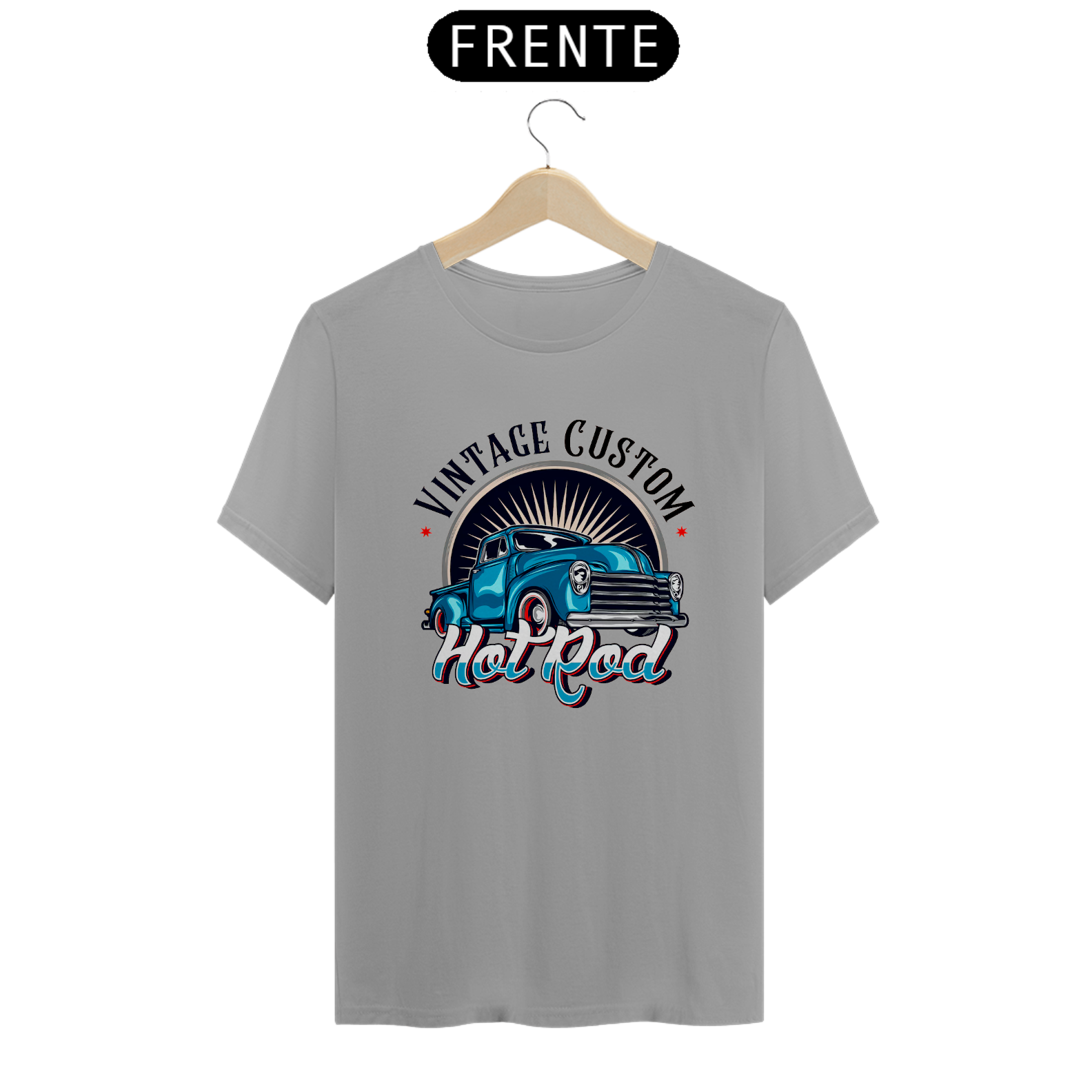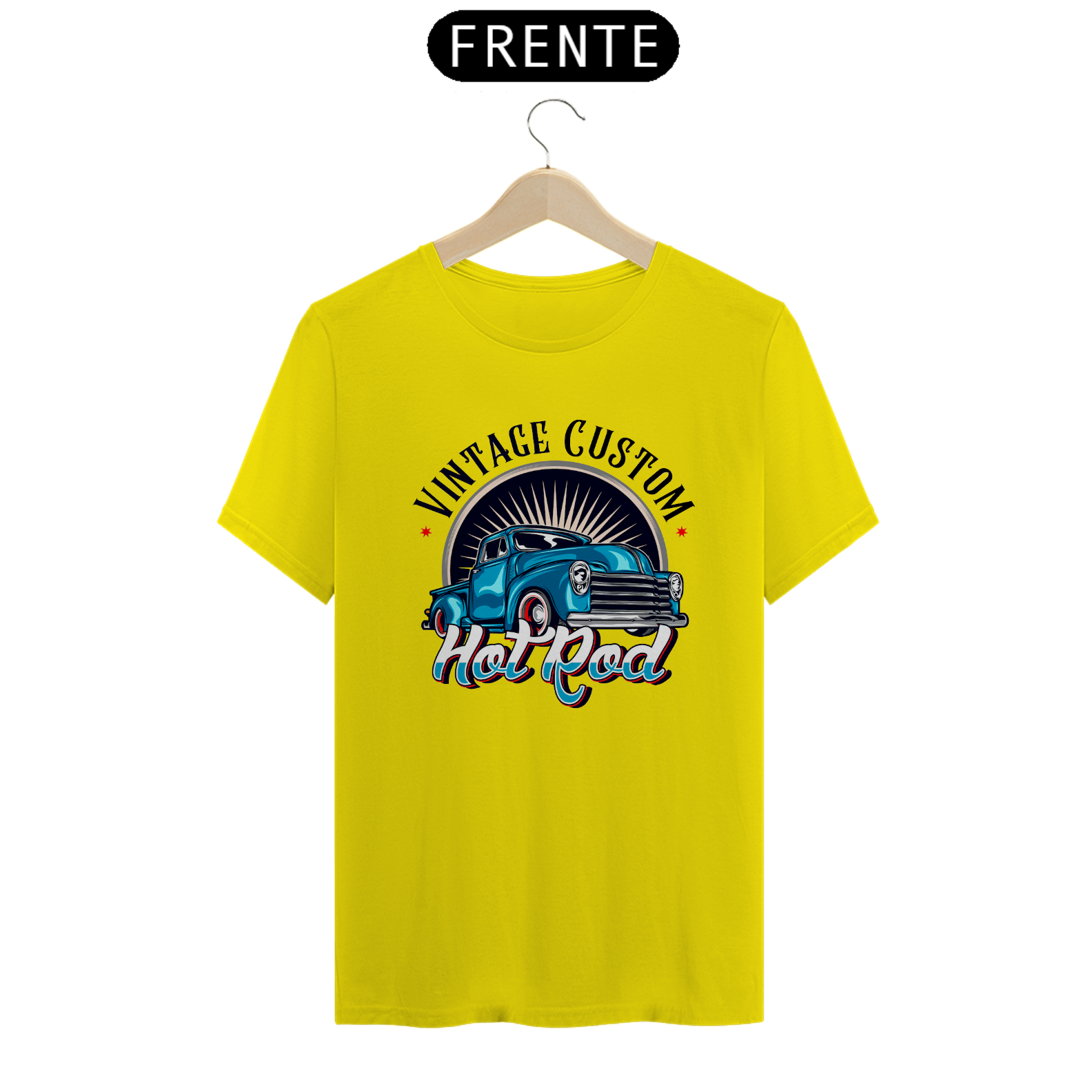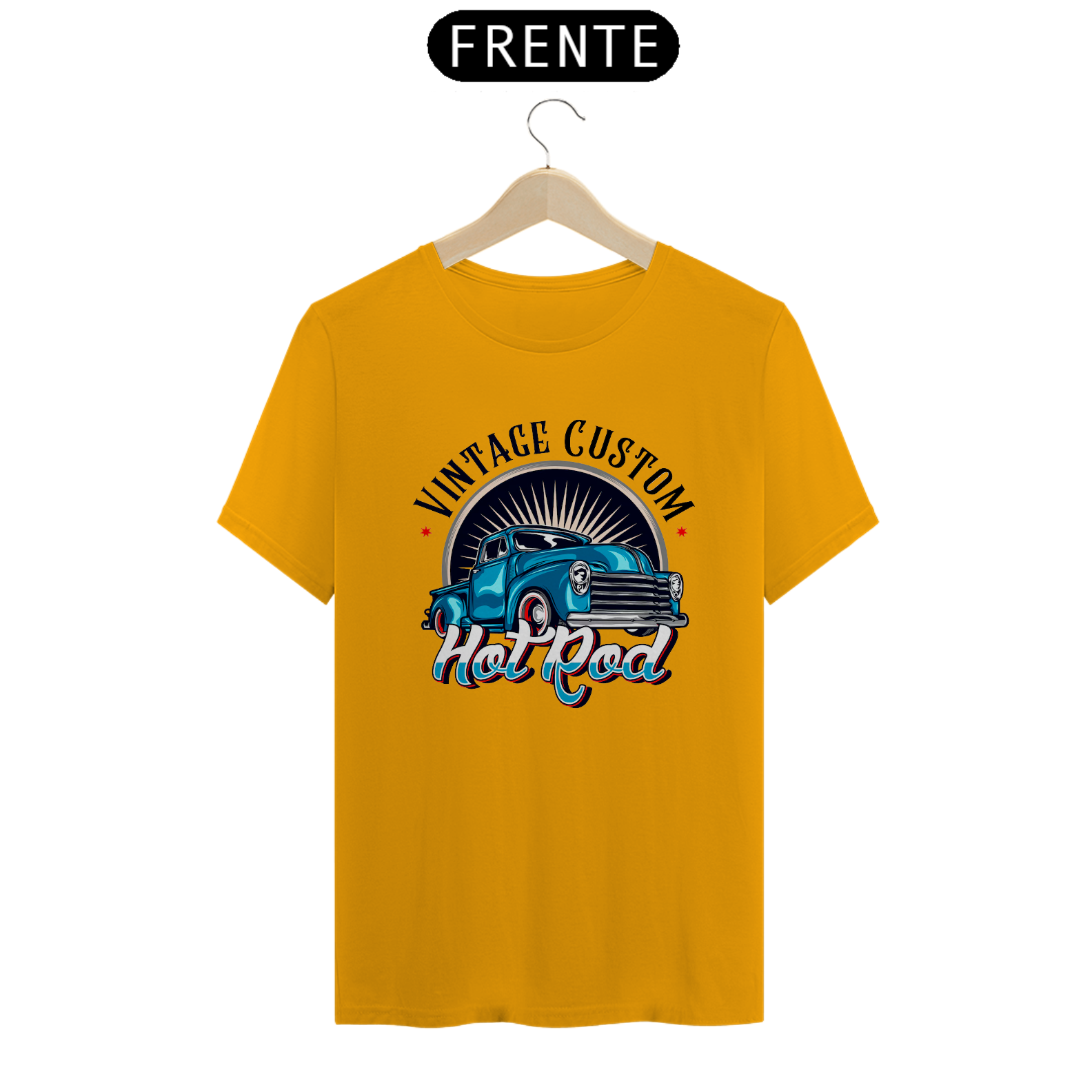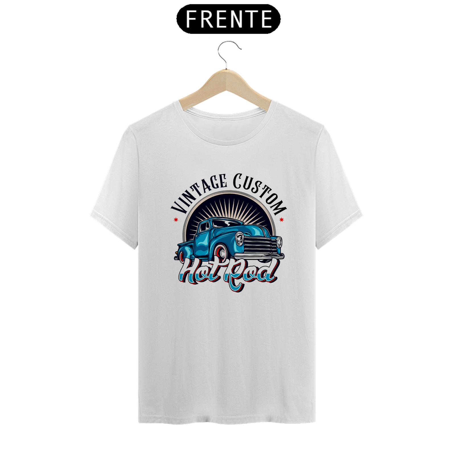 Acima da imagem, a inscrição "Vintage Custom" anuncia o estilo que nunca sai de moda, e abaixo, a palavra "Hot Rods" sela o pertencimento dessa máquina à cultura que valoriza potência, personalidade e atitude.
