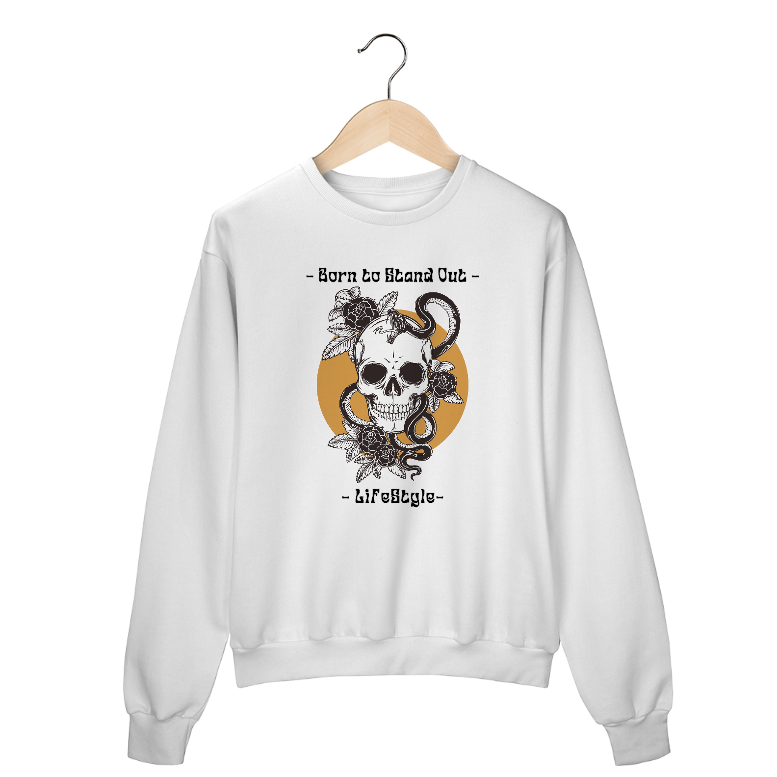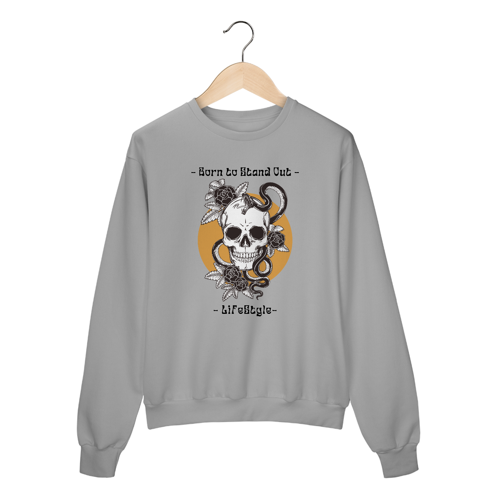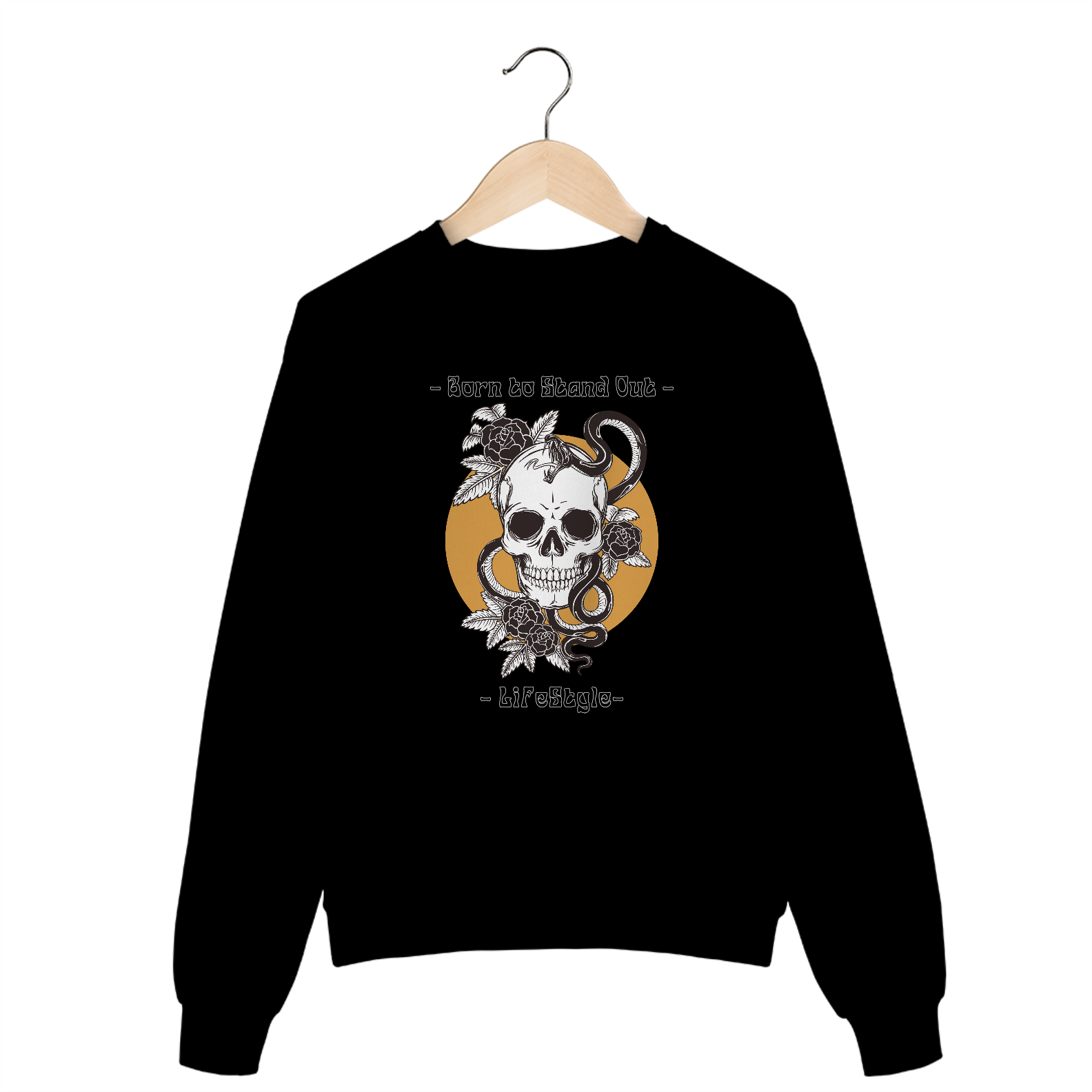 Acima da arte, a frase “Born to Stand Out” (“Nascido para se destacar”) deixa clara a proposta: este moletom é para quem não nasceu para seguir padrões. Logo abaixo, a palavra "Lifestyle", que reforça que mais do que um estilo visual, isso é um modo de vida.