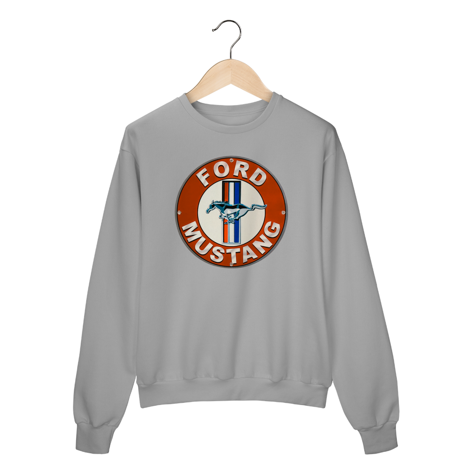 Ao redor da estampa, a frase “FORD MUSTANG” envolve o cavalo com letras marcantes, evocando o espírito livre, a força e o legado que esse modelo representa desde os anos 60.