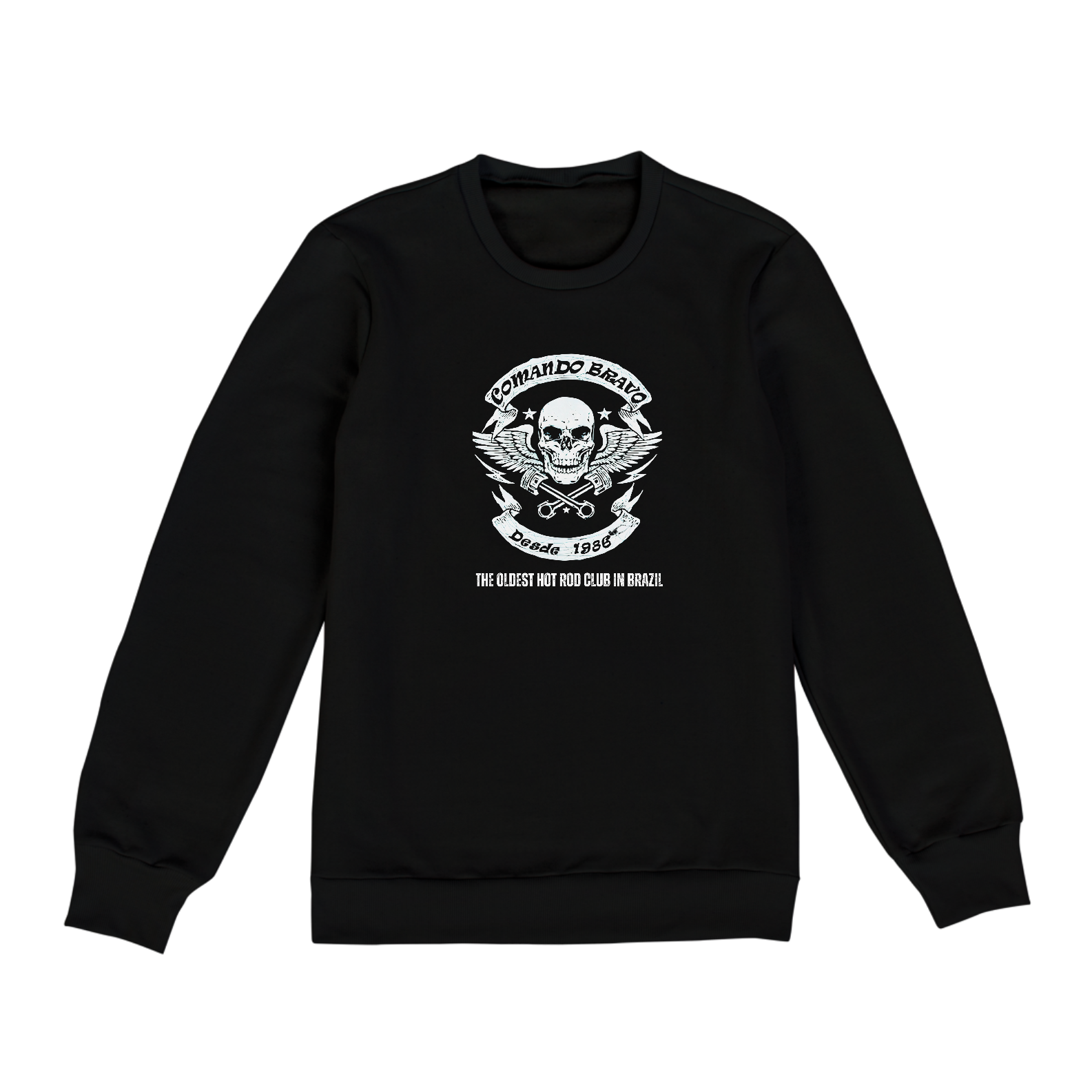 Descubra o conforto e o estilo com nosso Moleton Fechado preto, estampado com o icônico logo Retrô do COMANDO BRAVO, o mais antigo clube de Hot Rods do Brasil.
